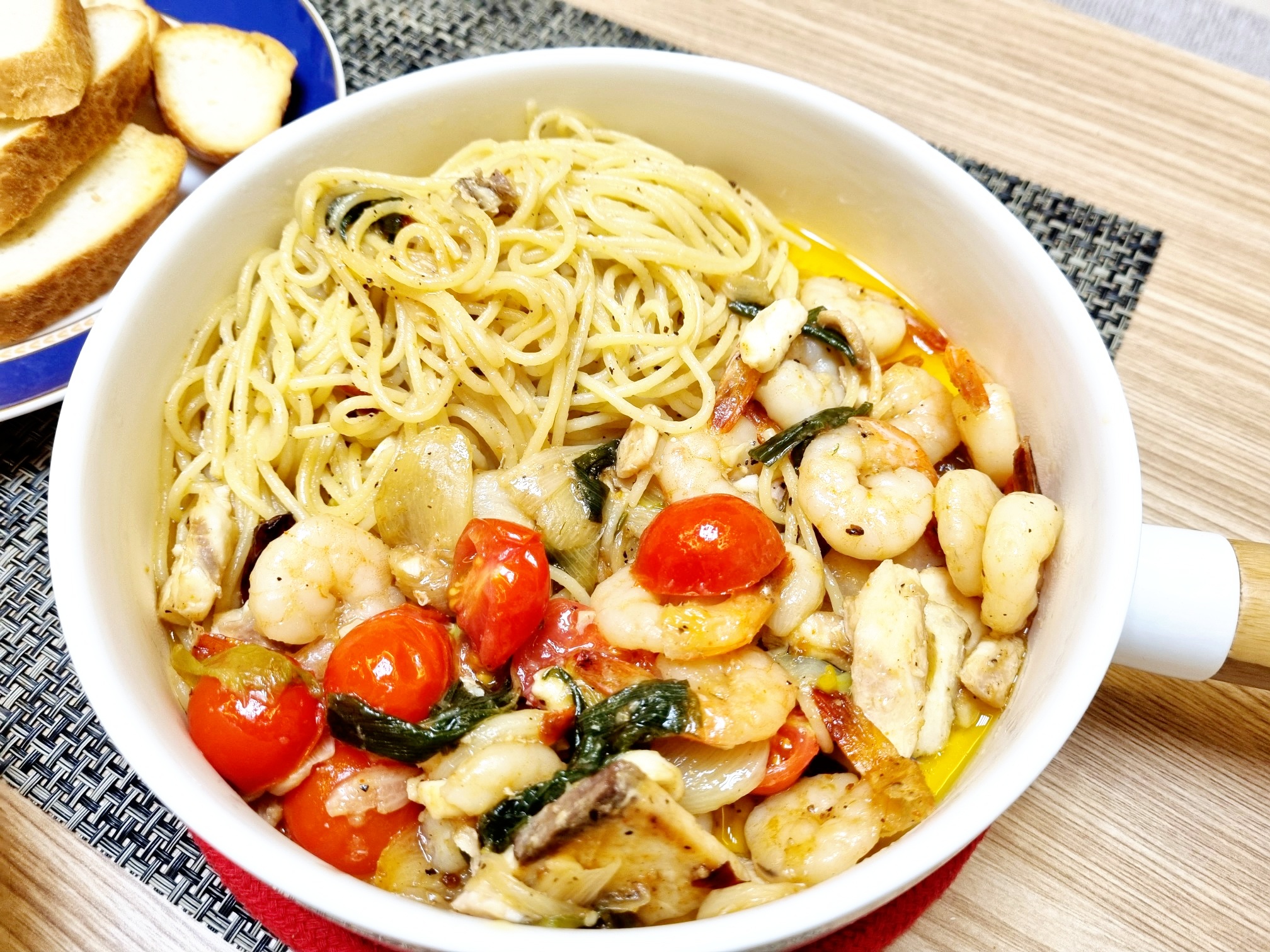 바게트빵, 올리브유, 생칵테일 새우, 파스타면, 대파, 마늘, 비법소스, 건고추, 소금/후추, 봉골레육수, 방울토마토