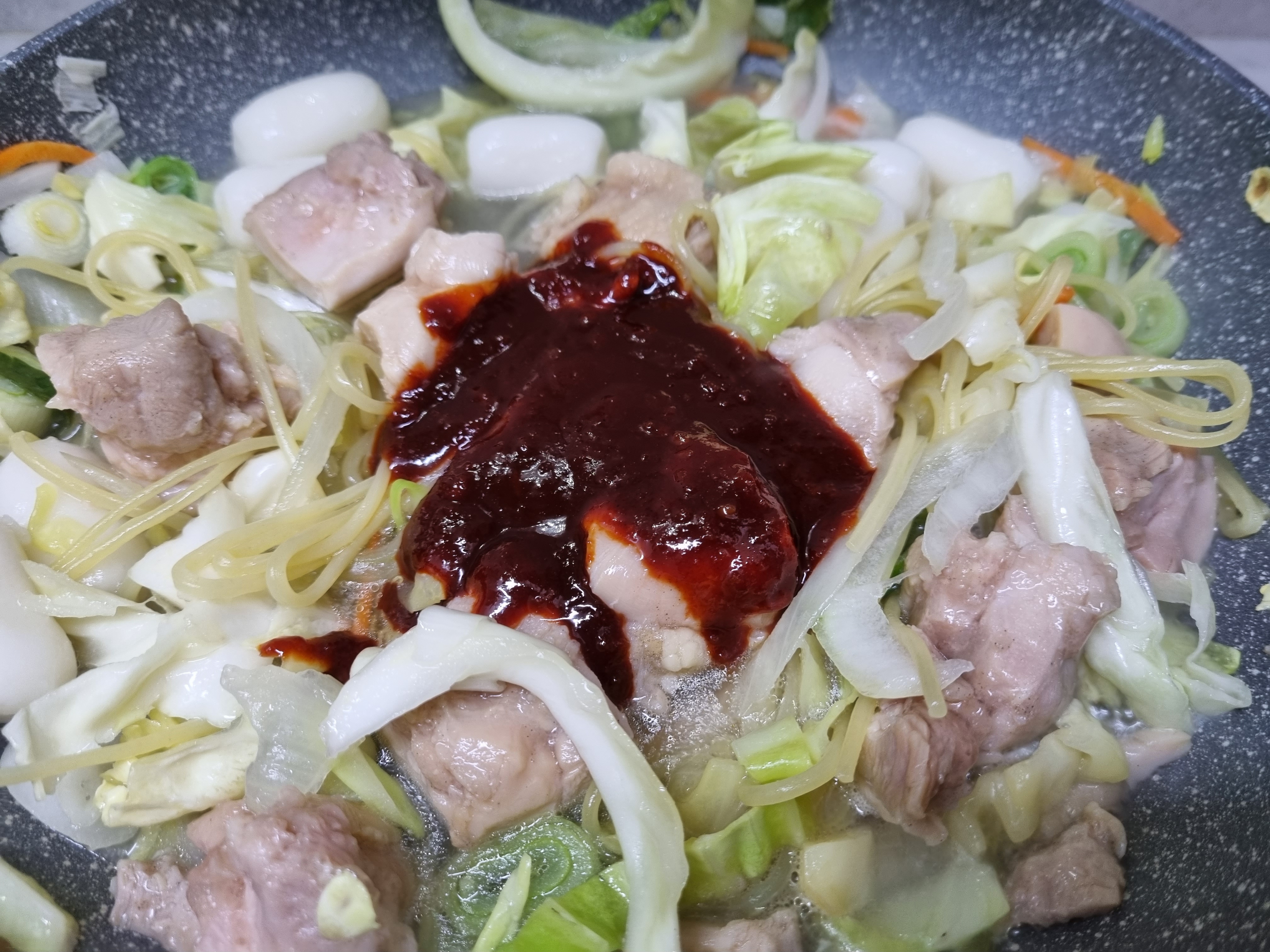 닭고기, 쫄면, 치즈, 치즈떡, 양배추, 양파, 대파, 당근, 양념