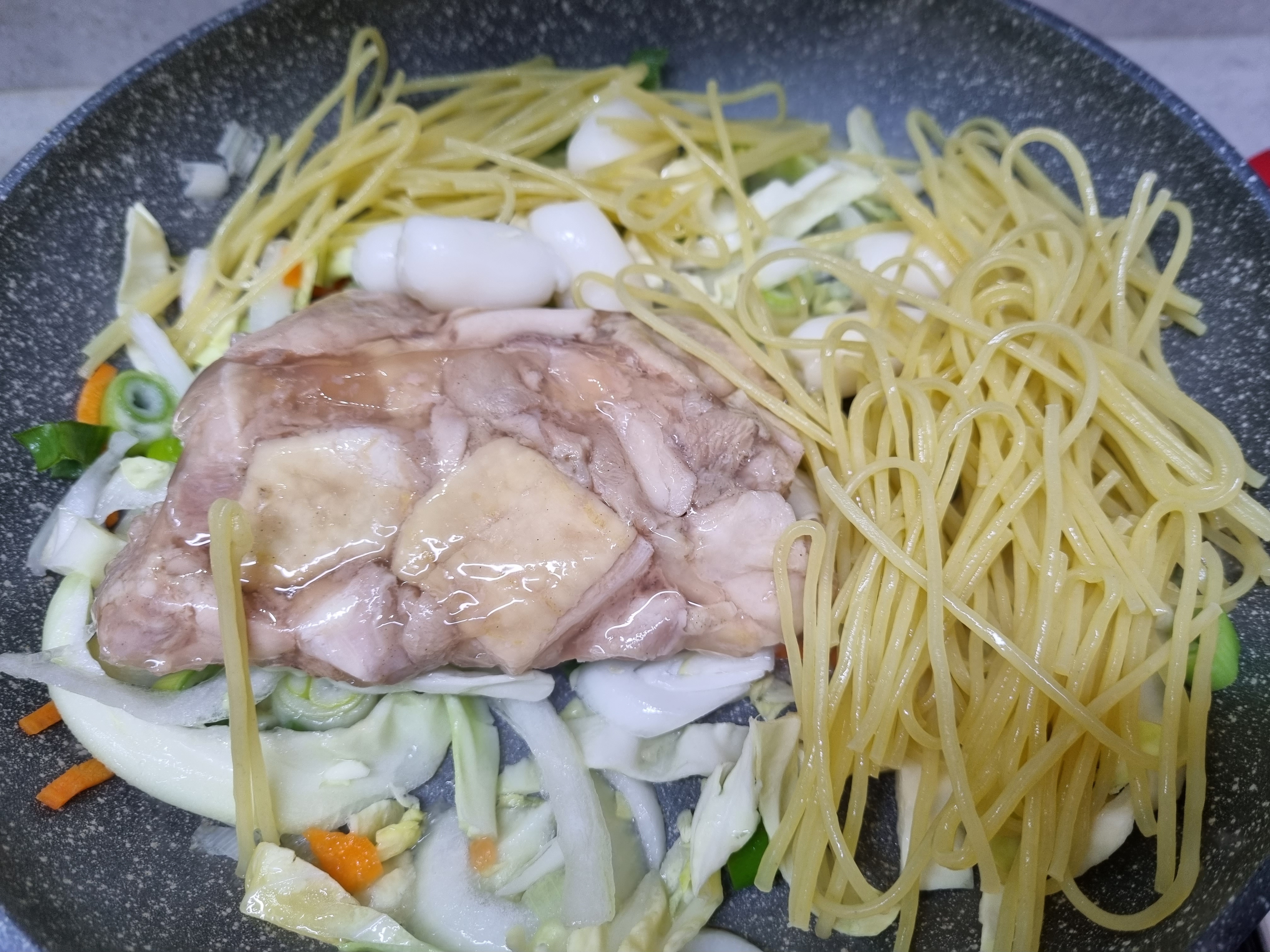 치즈떡, 쫄면, 닭고기를 넣고 중불에서 2분간 더 볶아준다