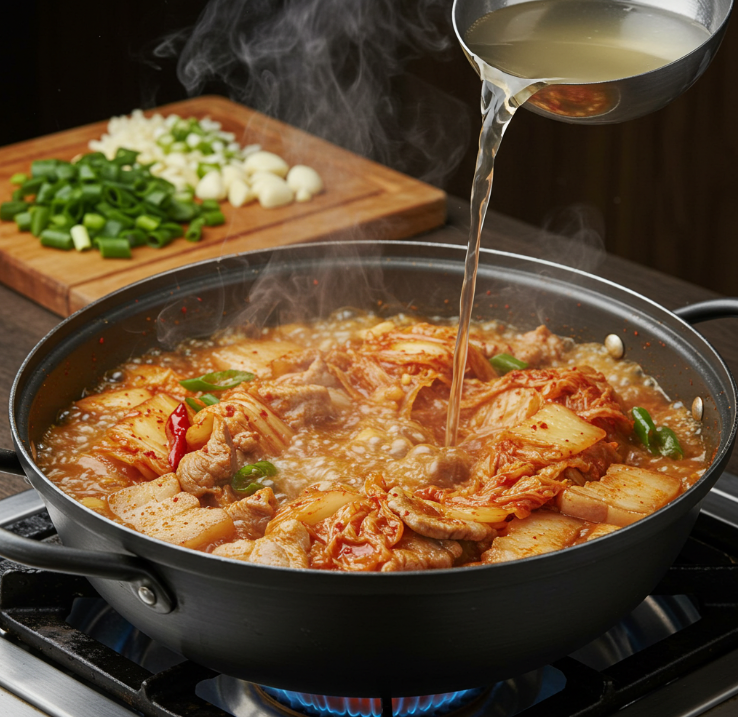 5. 강한 불에서 끓어오르면 불을 중간으로 줄이고 15~20분간 끓여주세요. 이 과정에서 김치의 깊은 맛이 국물에 우러나옵니다.