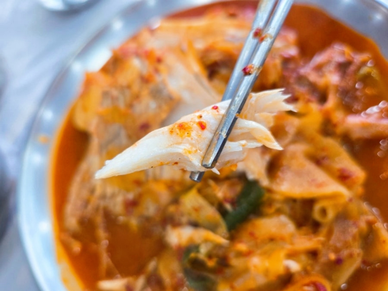 가오리는 흰살 생선이지만 살짝 쫄깃한 식감이 매력적이에요. 일반적인 생선찜과는 또 다른 특별한 식감을 느낄 수 있어요. 특히 이 집은 양파로 자연스러운 단맛을 내서 매운 양념과 조화롭게 어우러집니다.