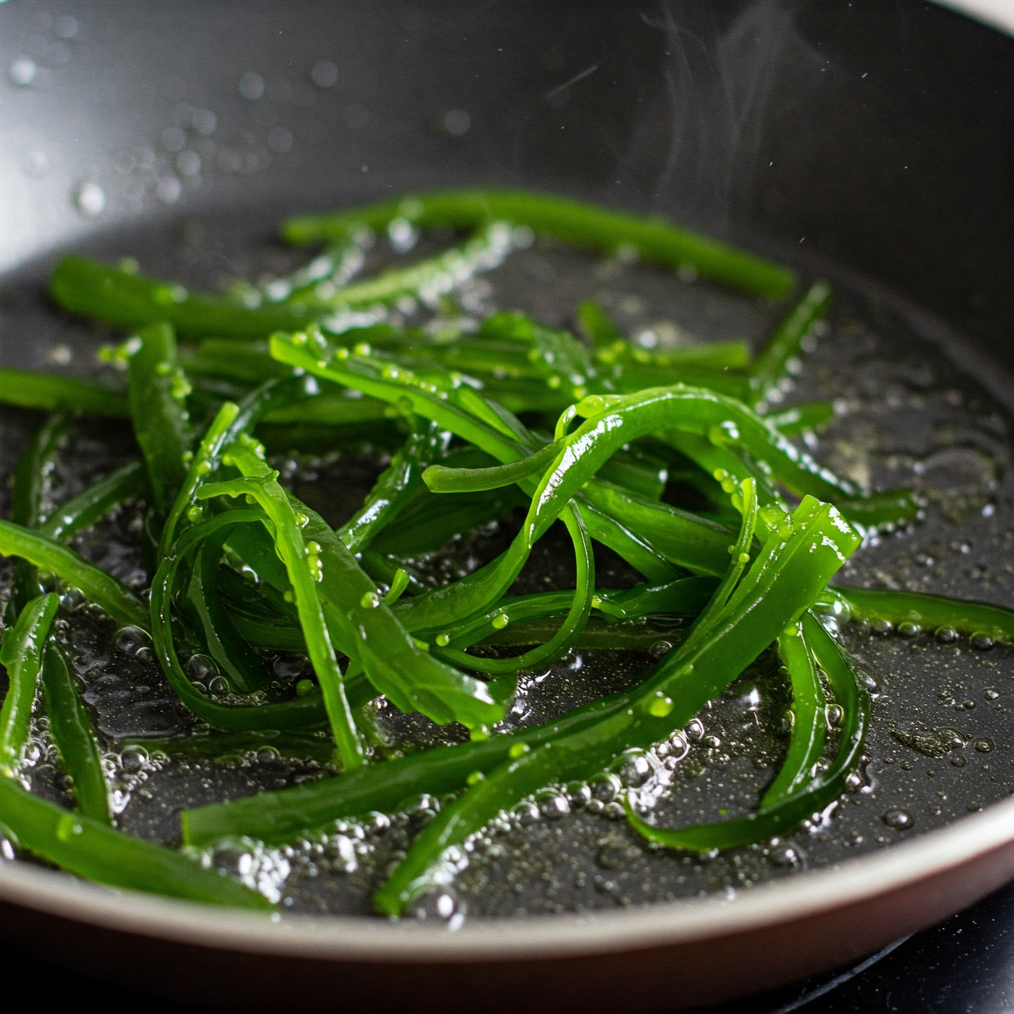 손질한 미역줄기를 팬에 넣고 센 불에서 2분 정도 볶아주세요. 이때 맛술을 넣어 비린내를 잡아줍니다.
