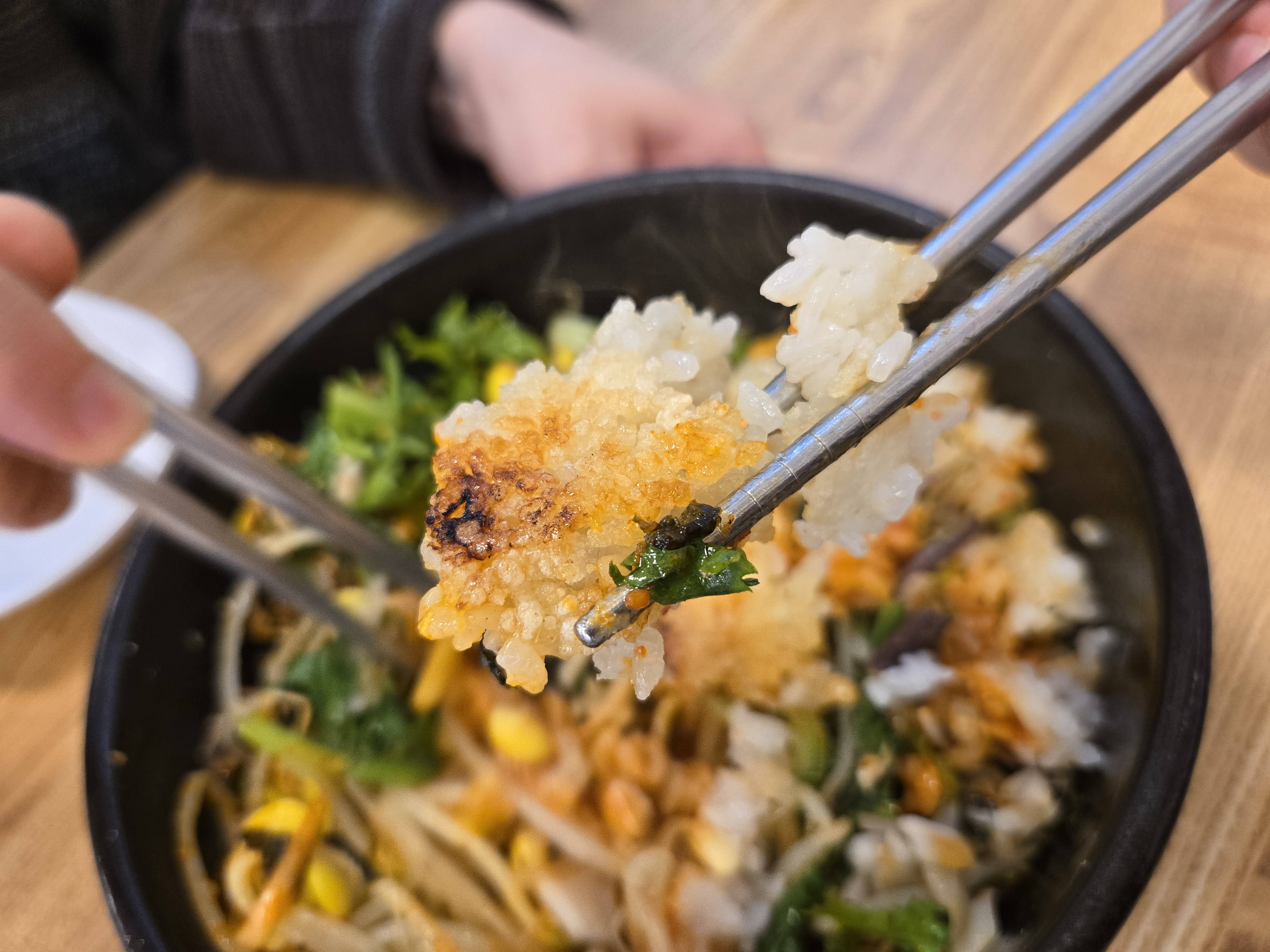 바닥에 누른 누룽지가 매력적인 돌솥비빔밥이 먼저 나왔어요.
