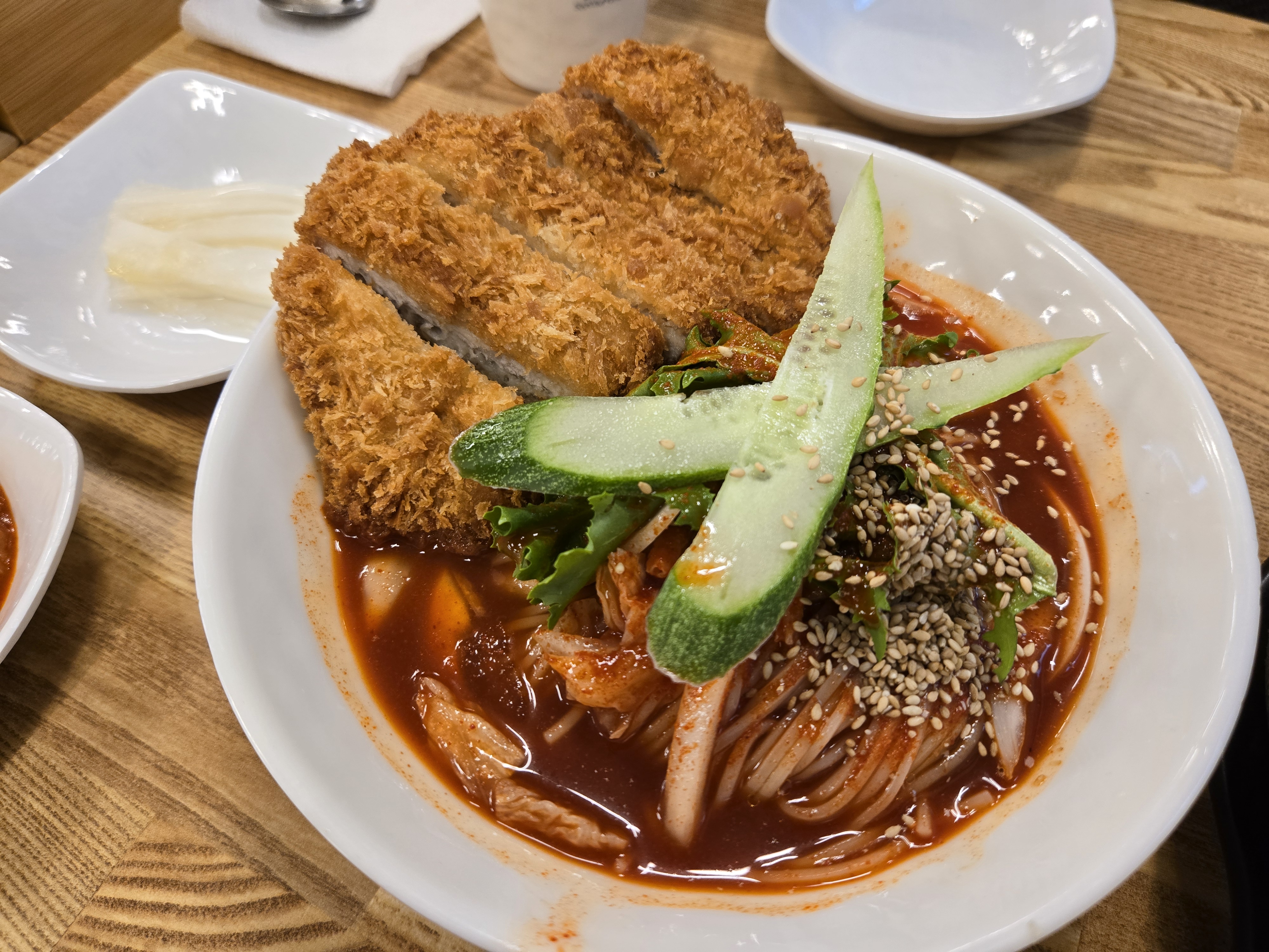 눅눅한 돈까스는 좋아하지 않아서 따로 돈까스를 덜어두고 국수와 돈까스를 따로따로 먹었는데요.