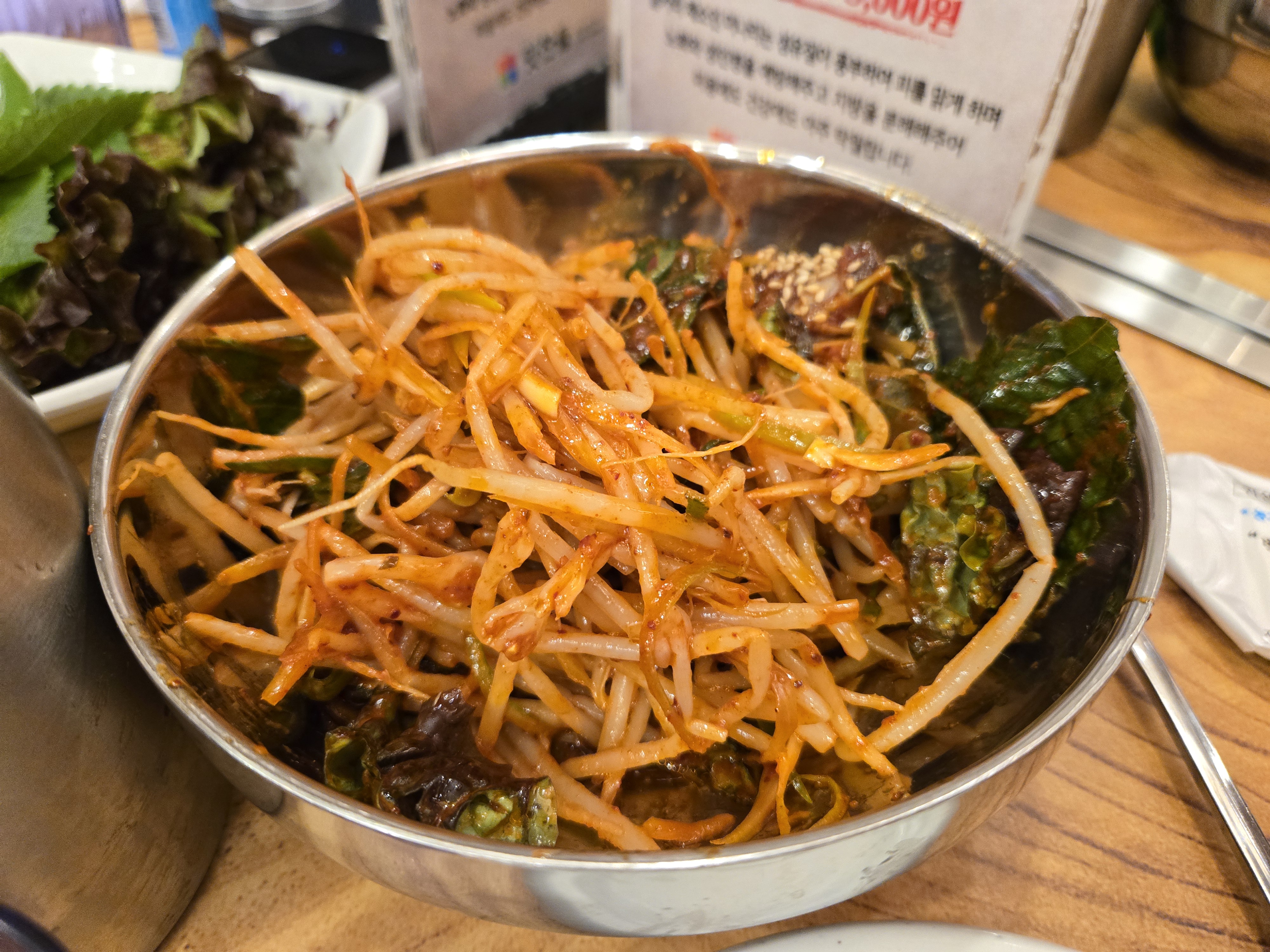 기본 반찬으로는 명이나물, 쌈야채 등이 제공되어요. 콩나물과 파가 섞인 콩나물파절이도 제공되고 있어요! 아삭아삭하니 고기와 잘 어울리더라구요.