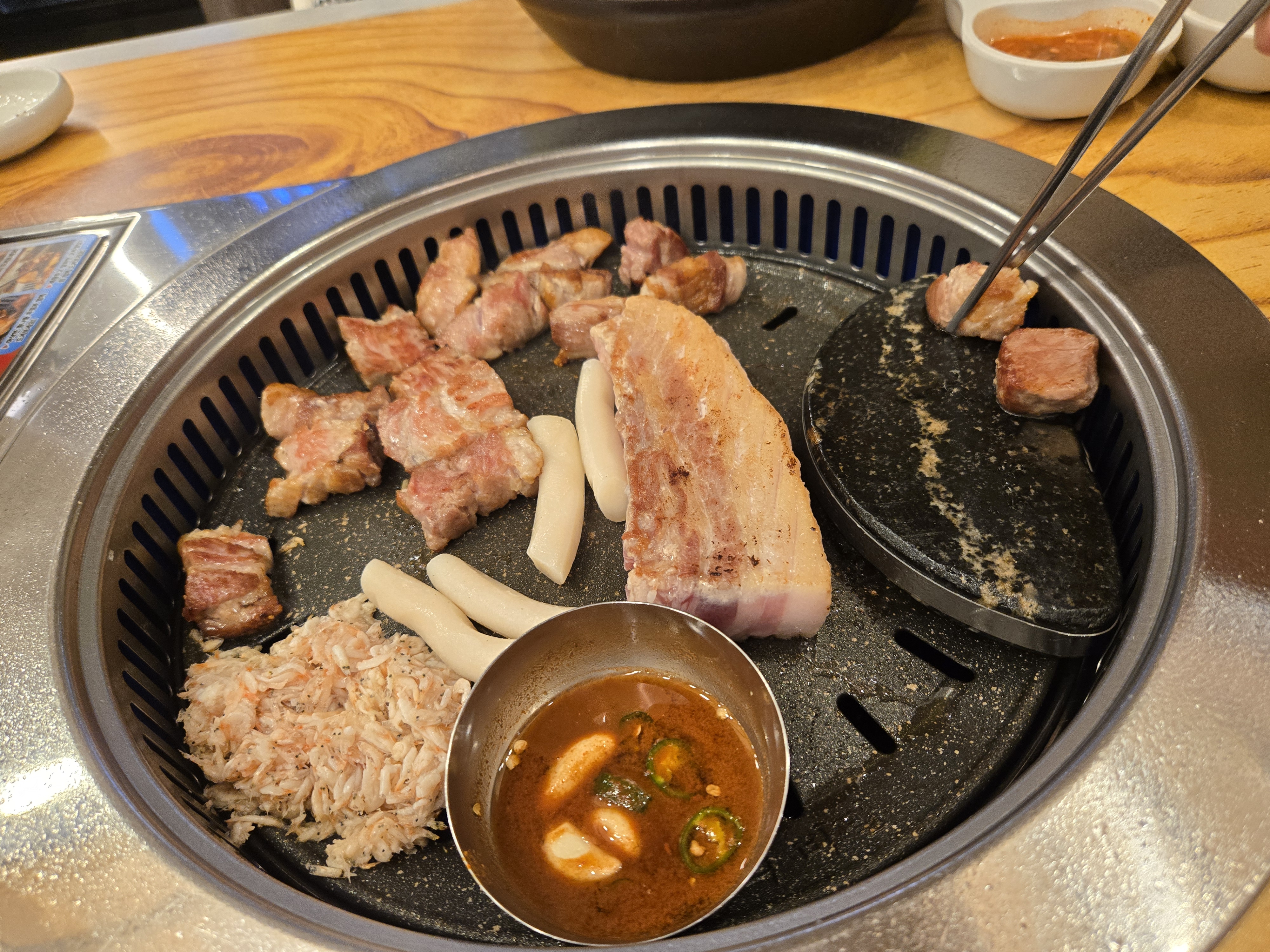 이곳의 특징 중 하나는 직원분들이 직접 고기를 구워주신다는 점이에요. 두툼한 숙성 삼겹살을 최적의 상태로 구워주셔서 육즙이 풍부하고 부드러운 식감을 느낄 수 있었어요. 특히, 구운 새우젓과 함께 먹는 방식이 독특했어요. 젓갈을 불판에 살짝 구워 고기와 함께 먹으니 감칠맛이 더해져 정말 맛있었어요.