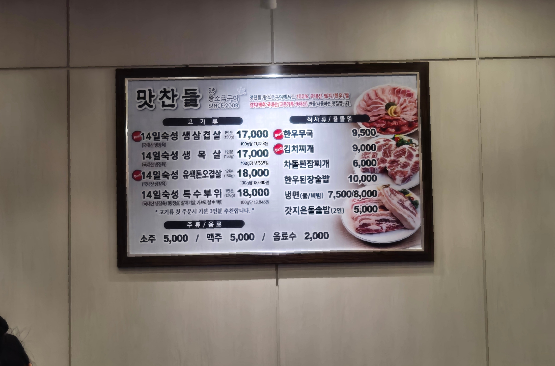산본 삼겹살 맛집 맛찬들 왕소금구이의 대표메뉴는 14일 숙성시킨 생삼겹살과 유색돈오겹살로 가격 대비 고기 질이 너무 좋아요. 식사 메뉴로는 돌솥밥, 차돌된장찌개, 한우된장술밥 등 이 준비되어 있었어요.