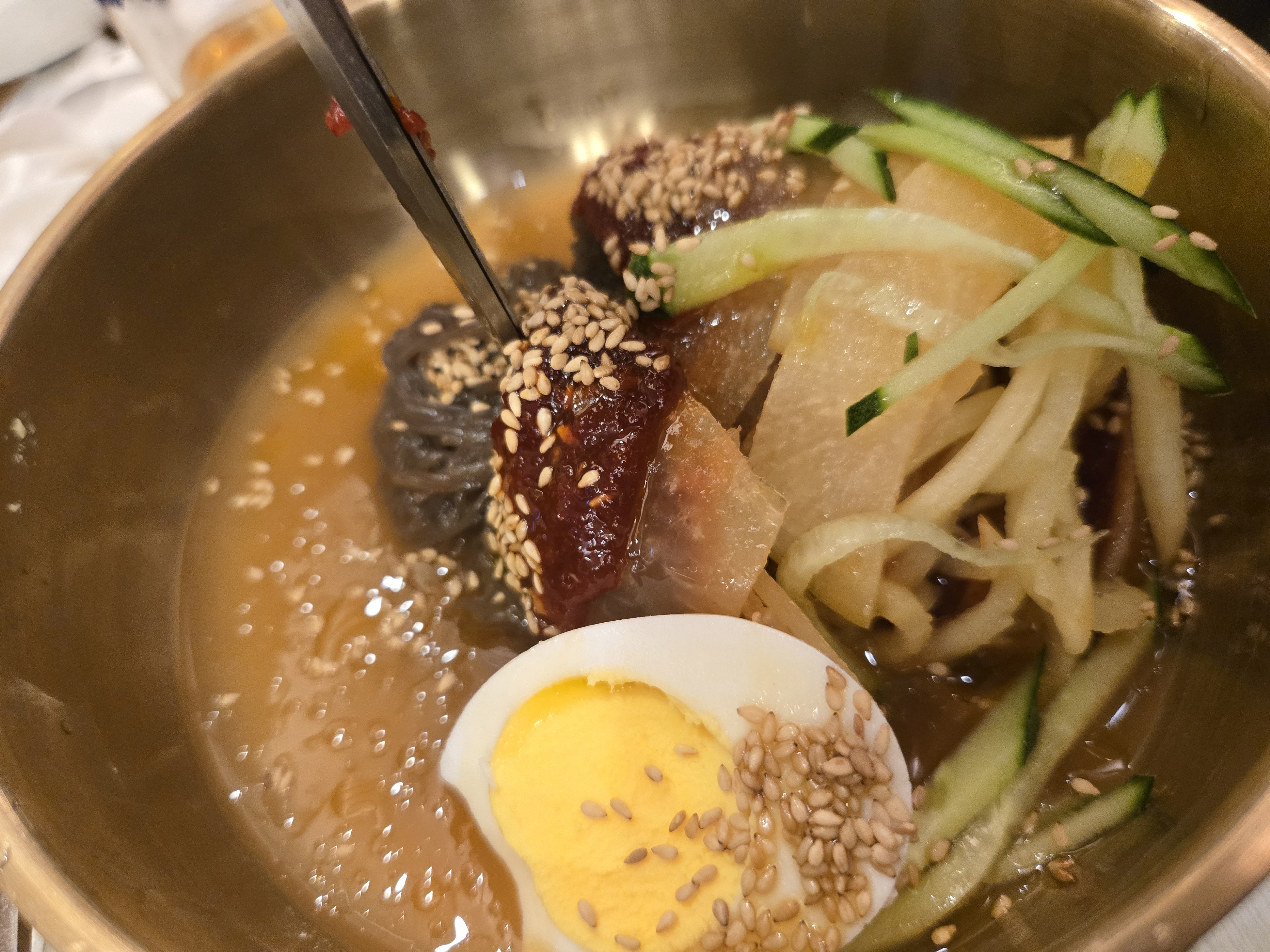 고기를 한 점 올려서 냉면도 같이 드세요.