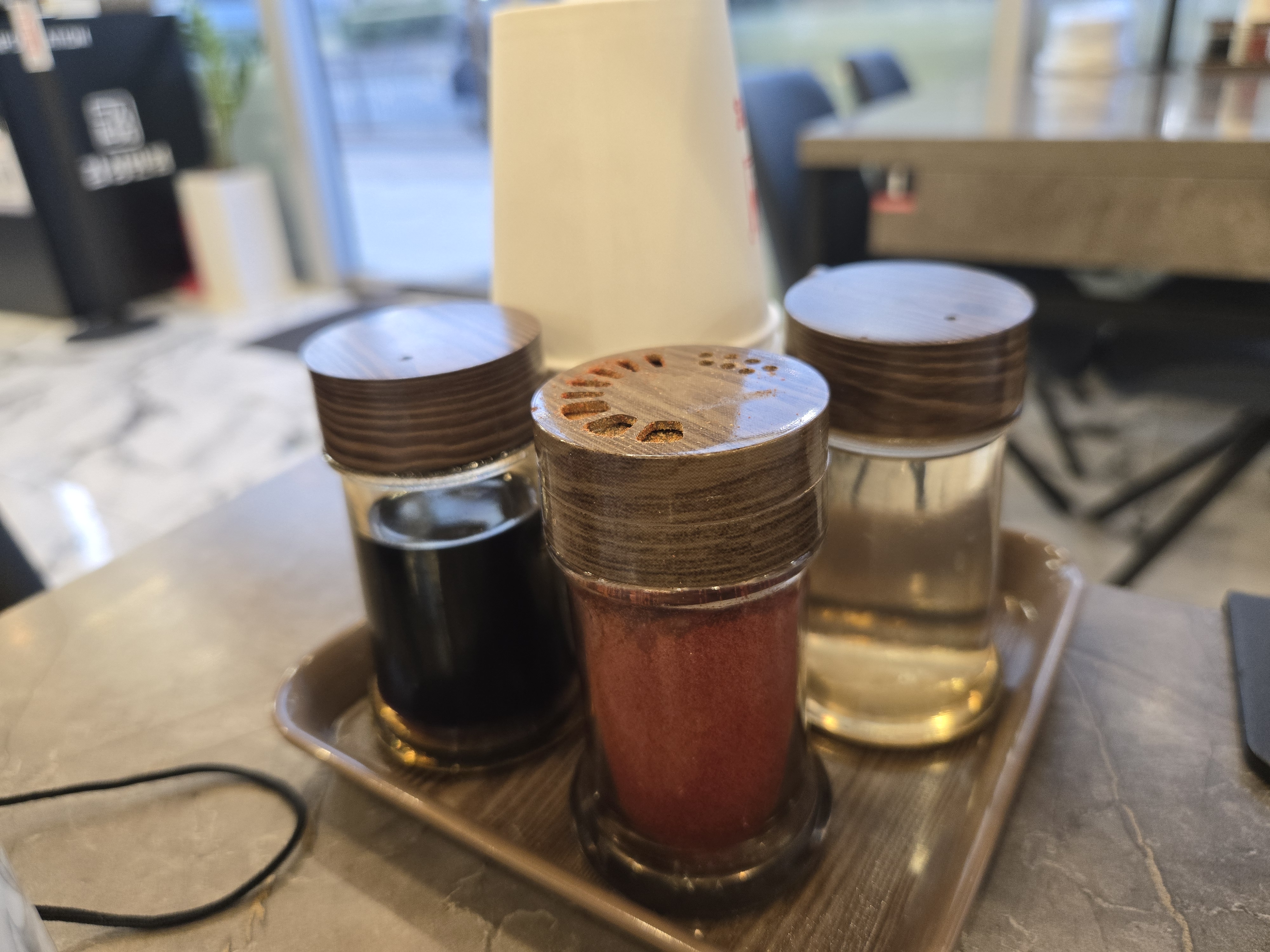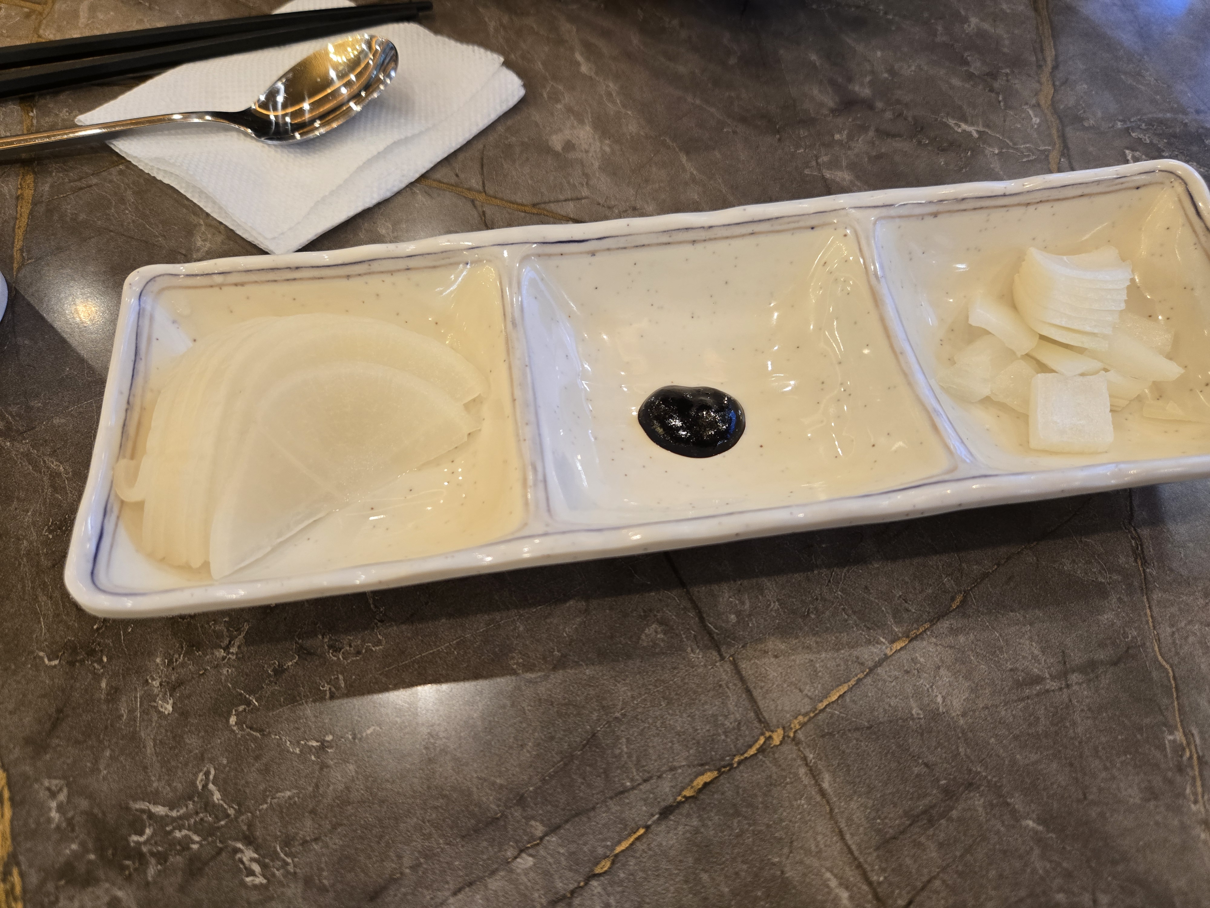 테이블마다 양념이 셋팅되어 있고, 기본으로 반찬도 나왔어요. 단무지가 흰색 단무지라서 너무 신기하더라구요.