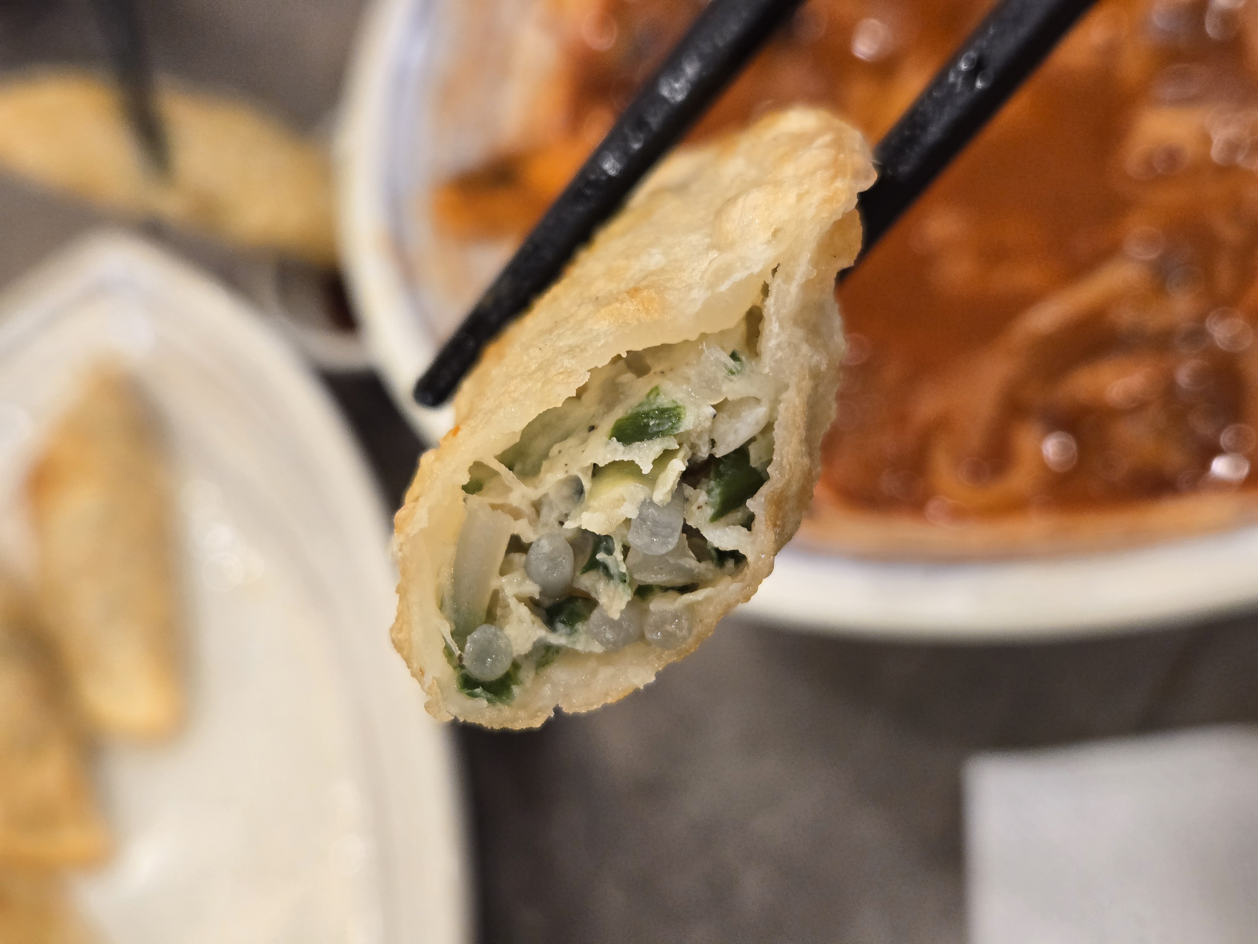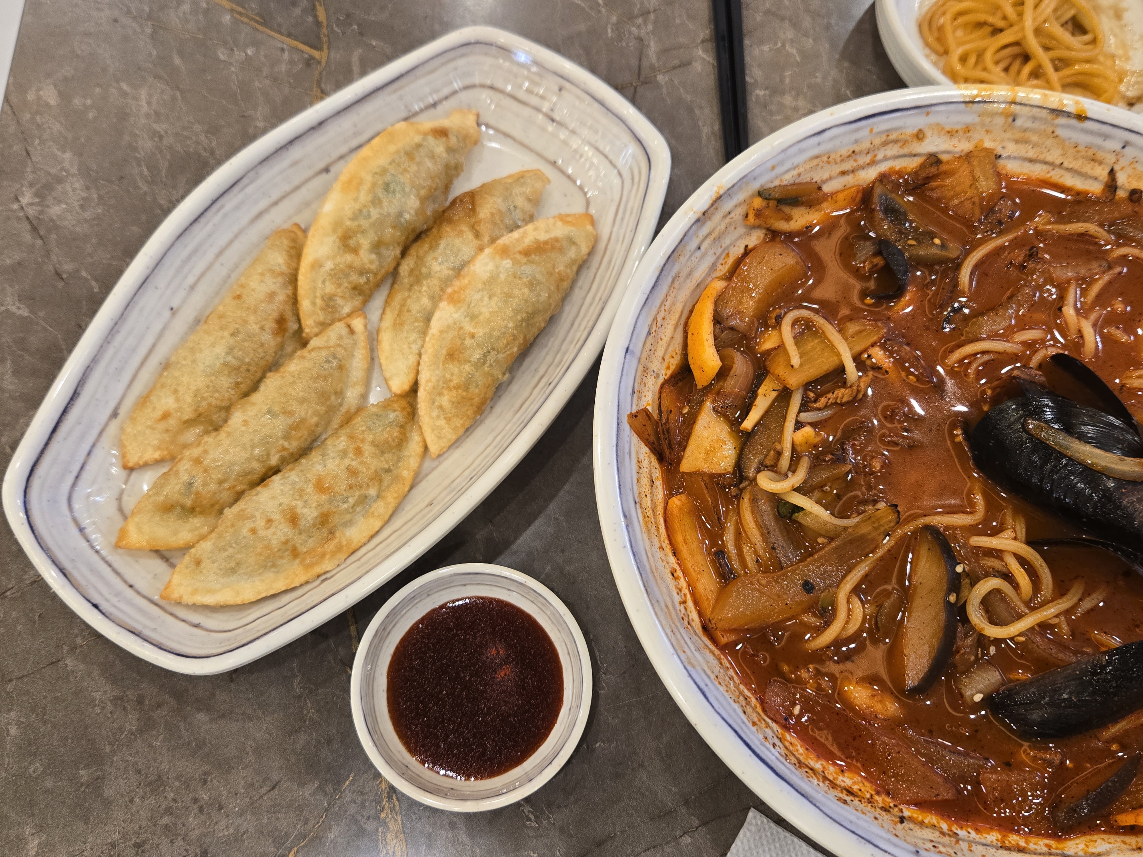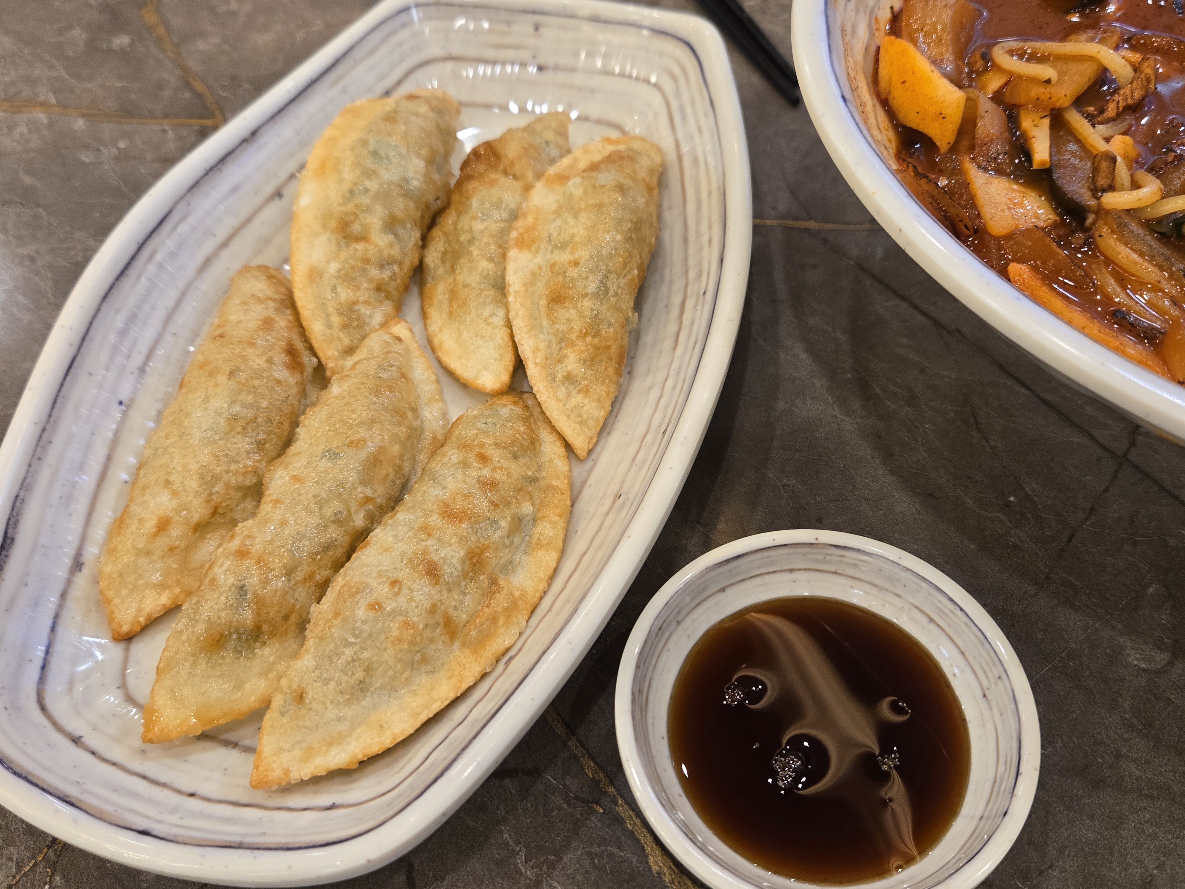 군만두는 갓 튀겨져 나와 바삭바삭하고 속은 촉촉했어요. 뜨거울 때 먹으니 더욱 맛있었어요. 서비스로 받은 메뉴였지만, 다음번에는 주문해서 먹을 정도!