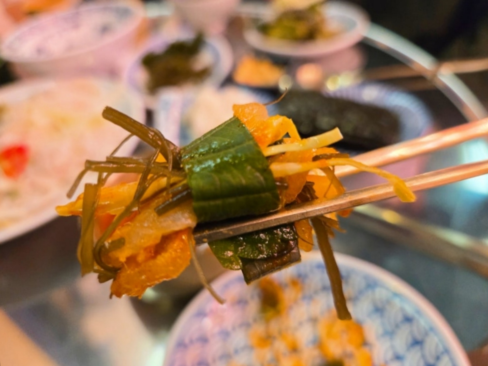 막회를 주문하면 상추, 깻잎, 김, 양배추, 백김치, 꼬시래기, 미역 등이 함께 제공돼요. 사장님께서 추천해주신 방법은 상추나 깻잎 위에 막회를 올리고 초장을 취향껏 더한 뒤, 꼬시래기와 미역을 함께 싸서 먹는 거예요. 이렇게 먹으면 초장의 새콤달콤한 맛과 막회의 쫄깃한 식감, 그리고 꼬시래기와 미역의 꼬들꼬들한 식감이 어우러져 입안에서 다양한 맛을 느낄 수 있어요. 또한, 함께 제공되는 콩가루를 추가하면 고소한 맛이 더해져 더욱 맛있답니다.