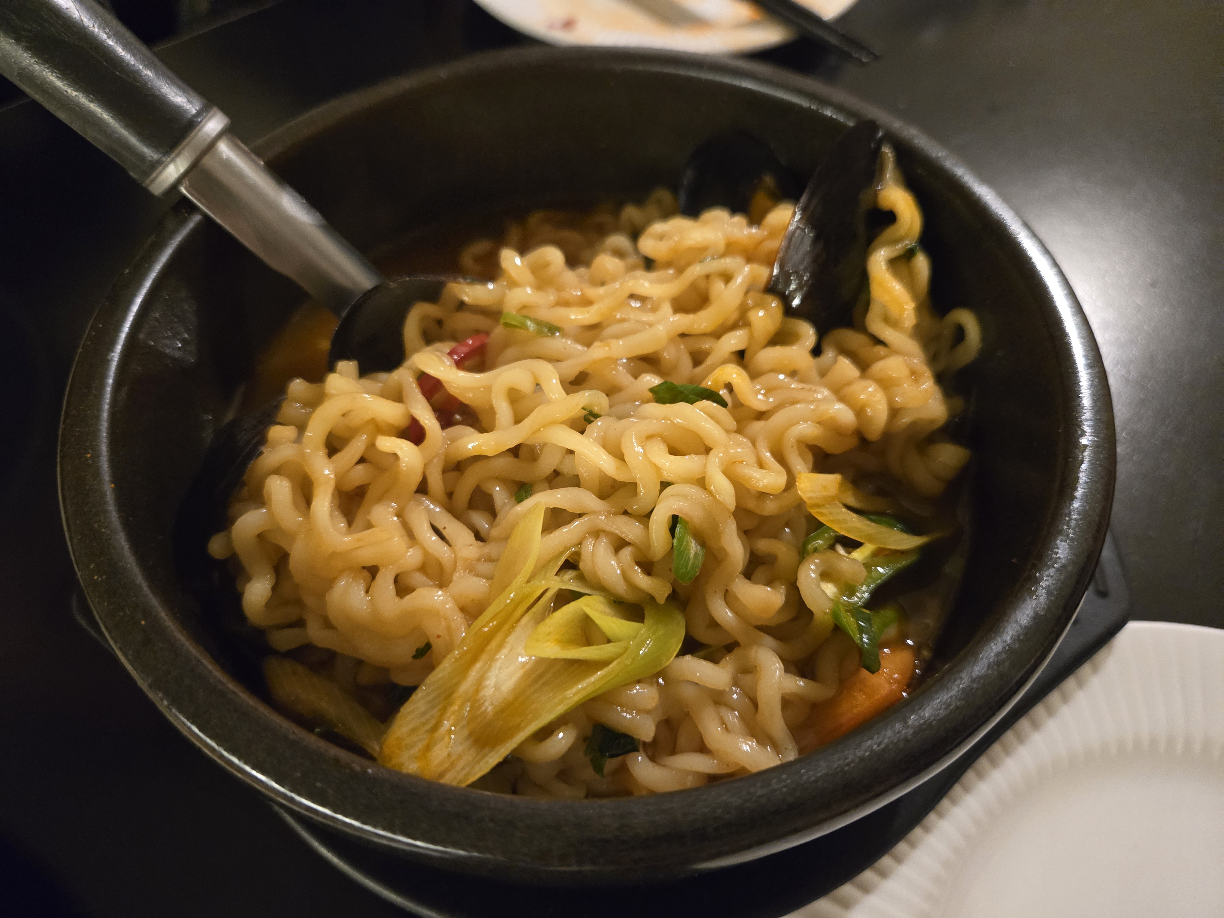이 비주얼 아니에요 .... 처음에 나올 때는 쫄깃한 면 상태인데, 제가 늦게 도착해서 불어버린 해물라면이에요. 소주에 가장 베이직한 안주! 이 상태 인데도 해물맛이 진하게 나서 맛있더라구요. 나오자마자 먹었음 훨씬 맛있었을 듯
