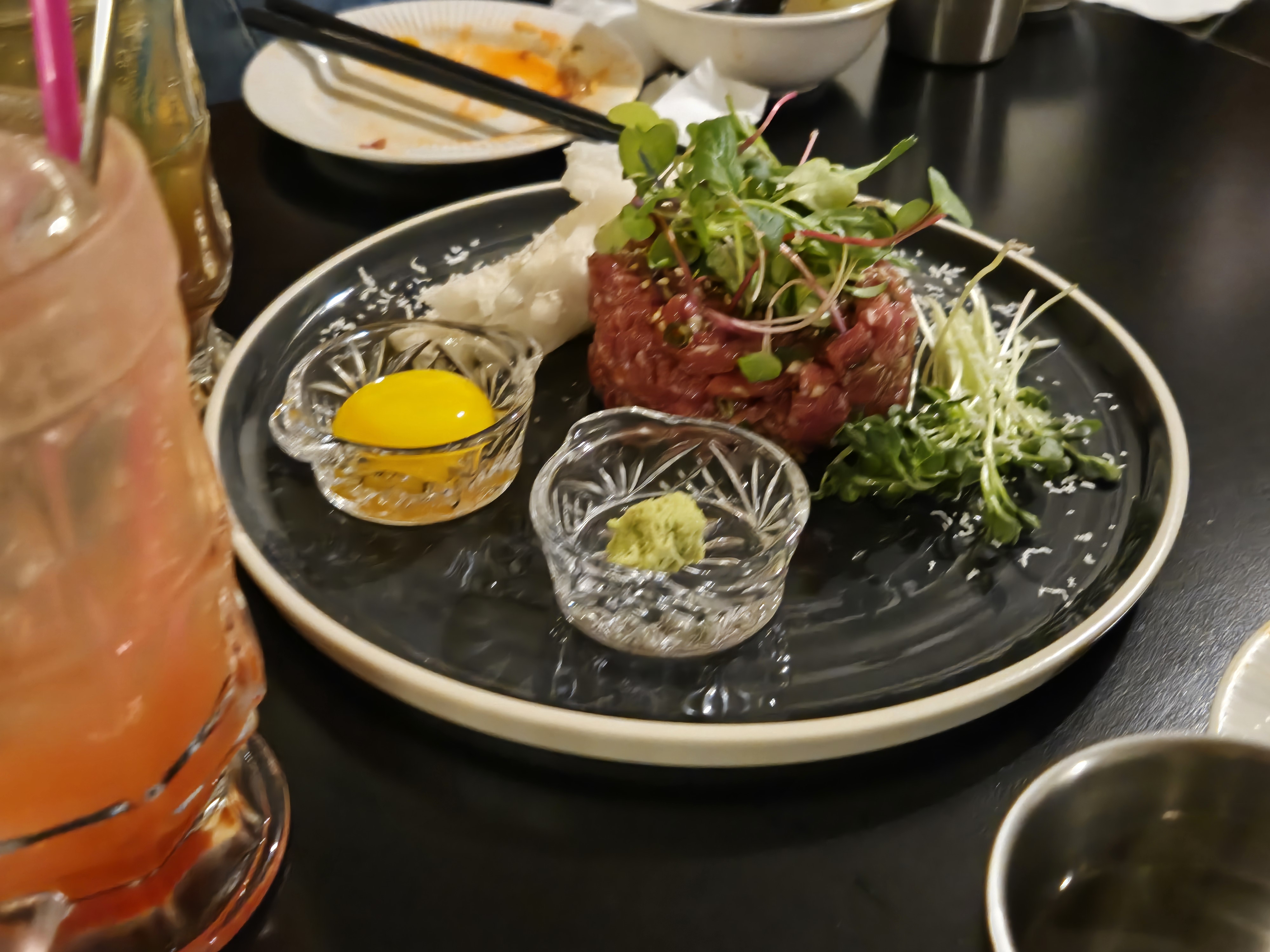 추천메뉴 중 하나인데요, 달걀 노른자랑 배도 포함되어 있는 육회의 정석이에요. 노른자를 가운데 넣어 비벼 배와 함께 곁들여 먹으면 진짜 쵝오! 생와사비도 주셔서 톡쏘는 맛까지 ~~~~ 맛 없을 수가 없는 맛이에요.