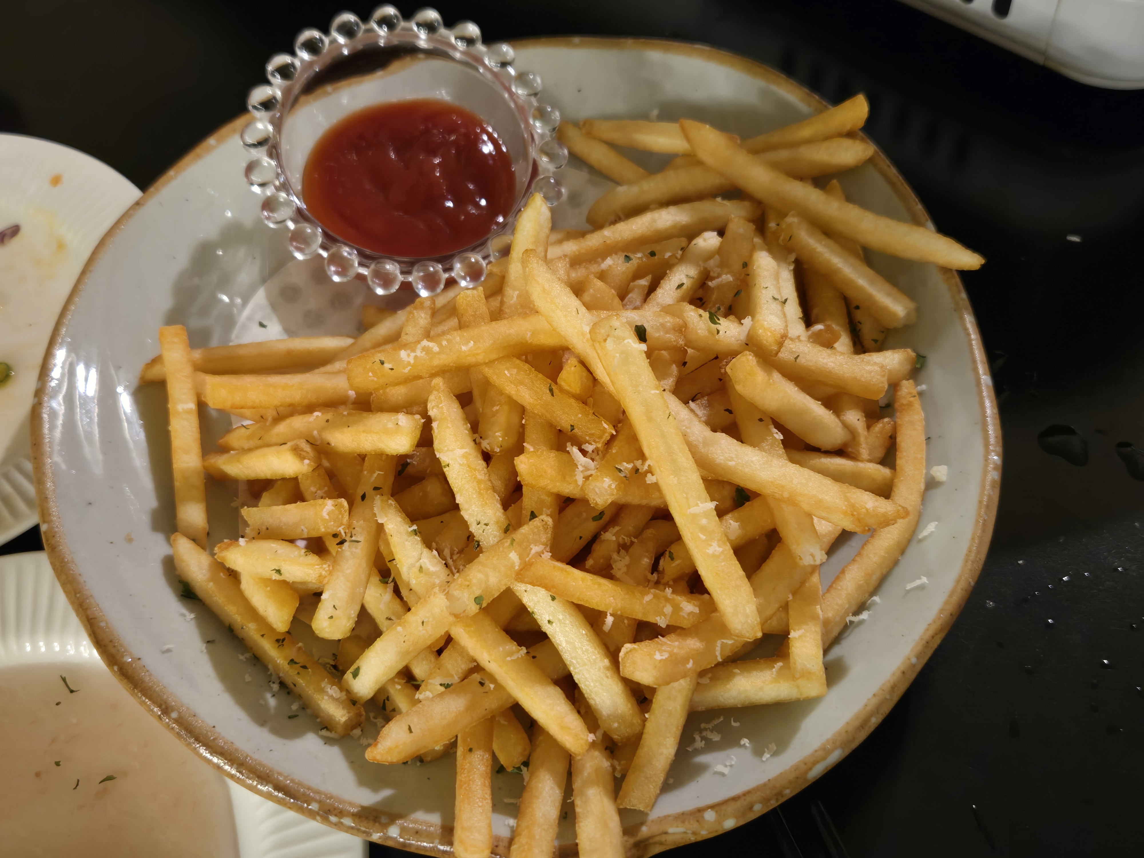 감자튀김 위에 파슬리가루와 치즈가 올라가있어요. 치즈의 꾸리꾸리한 냄새가 나서 더 좋았던 것 같은데요. 이런 치즈의 맛 때문에 꺼리는 분도 있긴 했어요.
