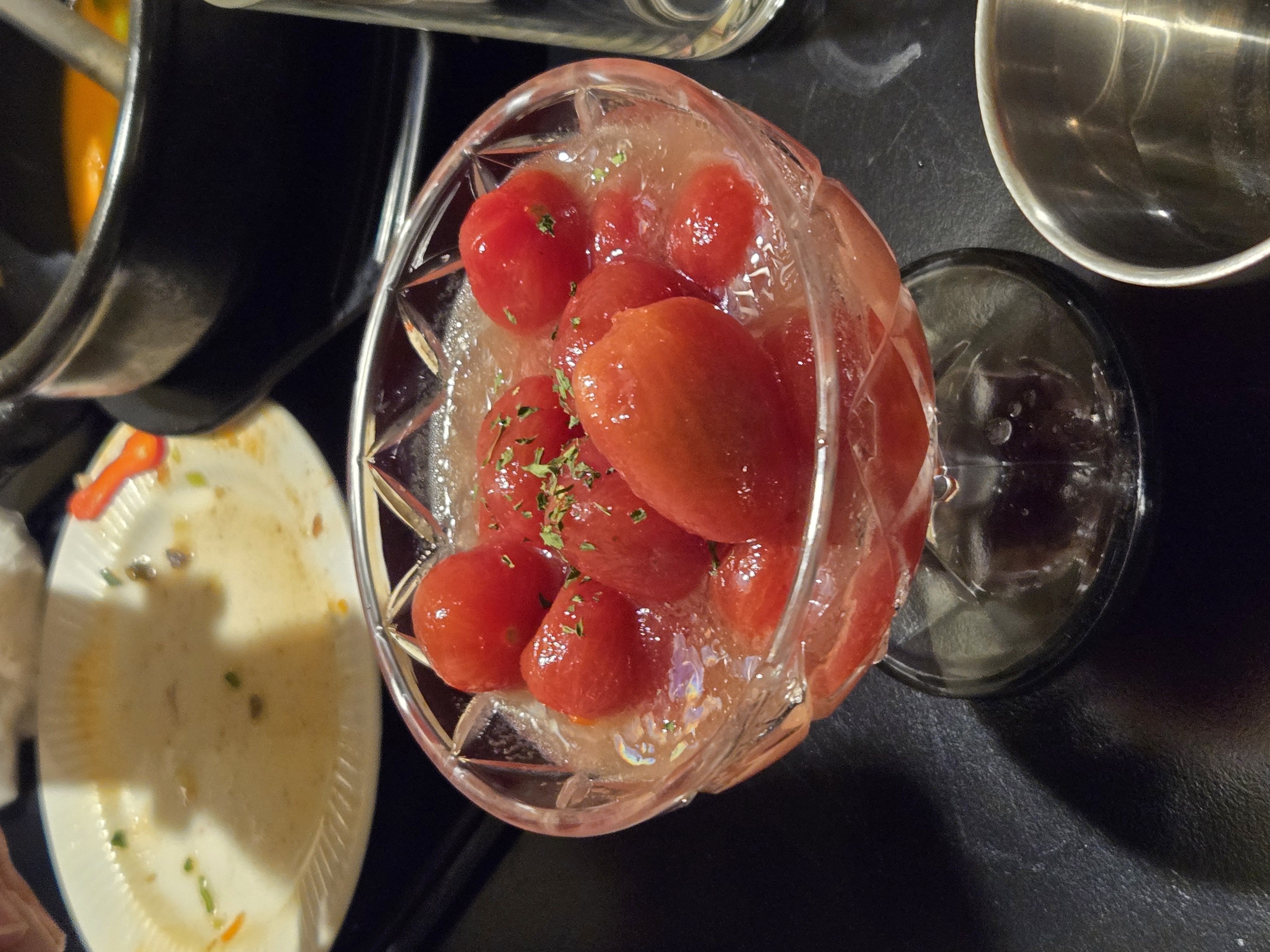 설탕에 절여진 과일을 좋아하지 않지만, 꿀토마토 절임을 한 입 먹으면 달콤한 맛에 한 번 더 집어먹게 되더라구요. 꿀 보다는 설탕의 맛이 더 느껴지는 맛이었지만 달콤한 디저트 같이서 마무리 할 안주로 딱이었어요.