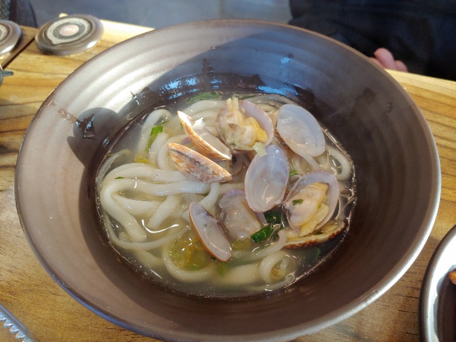 모래가 떨어지는 동안 주문한 바지락칼국수가 팔팔 끓어 먹음직스러운 비주얼이 되었습니다.
