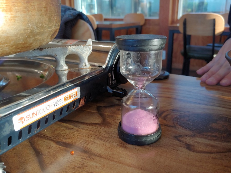 모래가 다 떨어지기를 기다린 시간은 대략 2-3분 정도 된 것 같습니다.