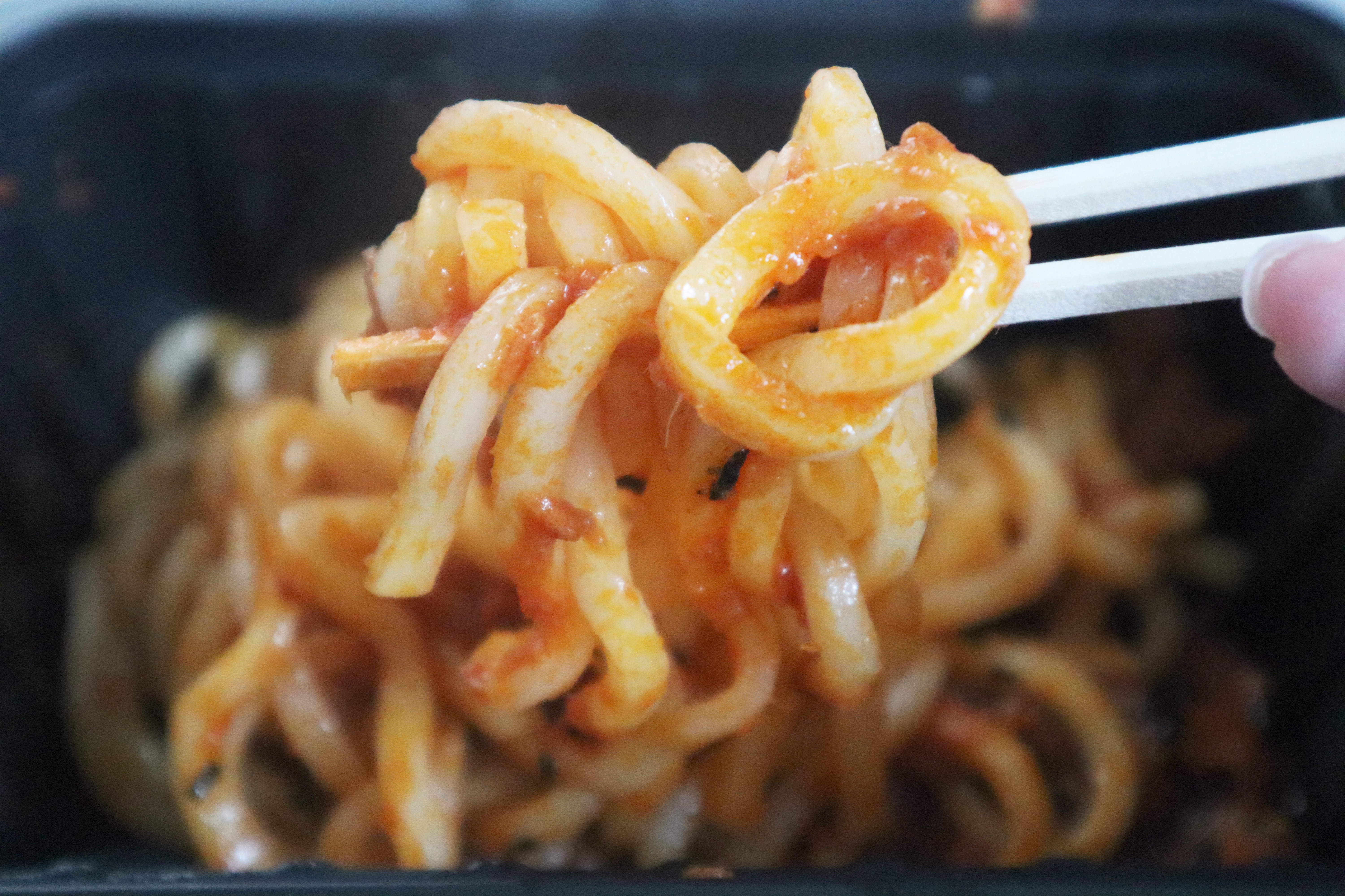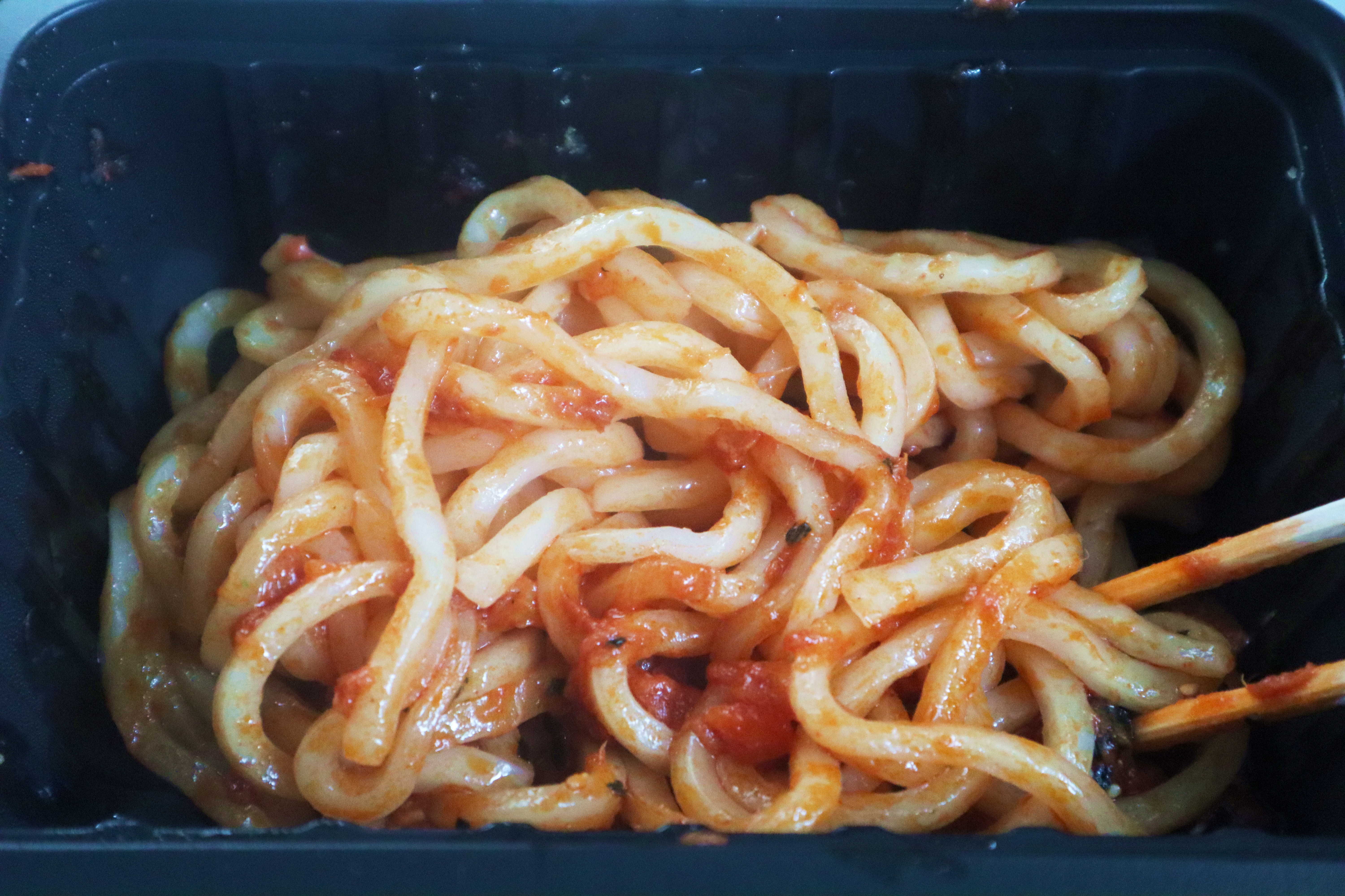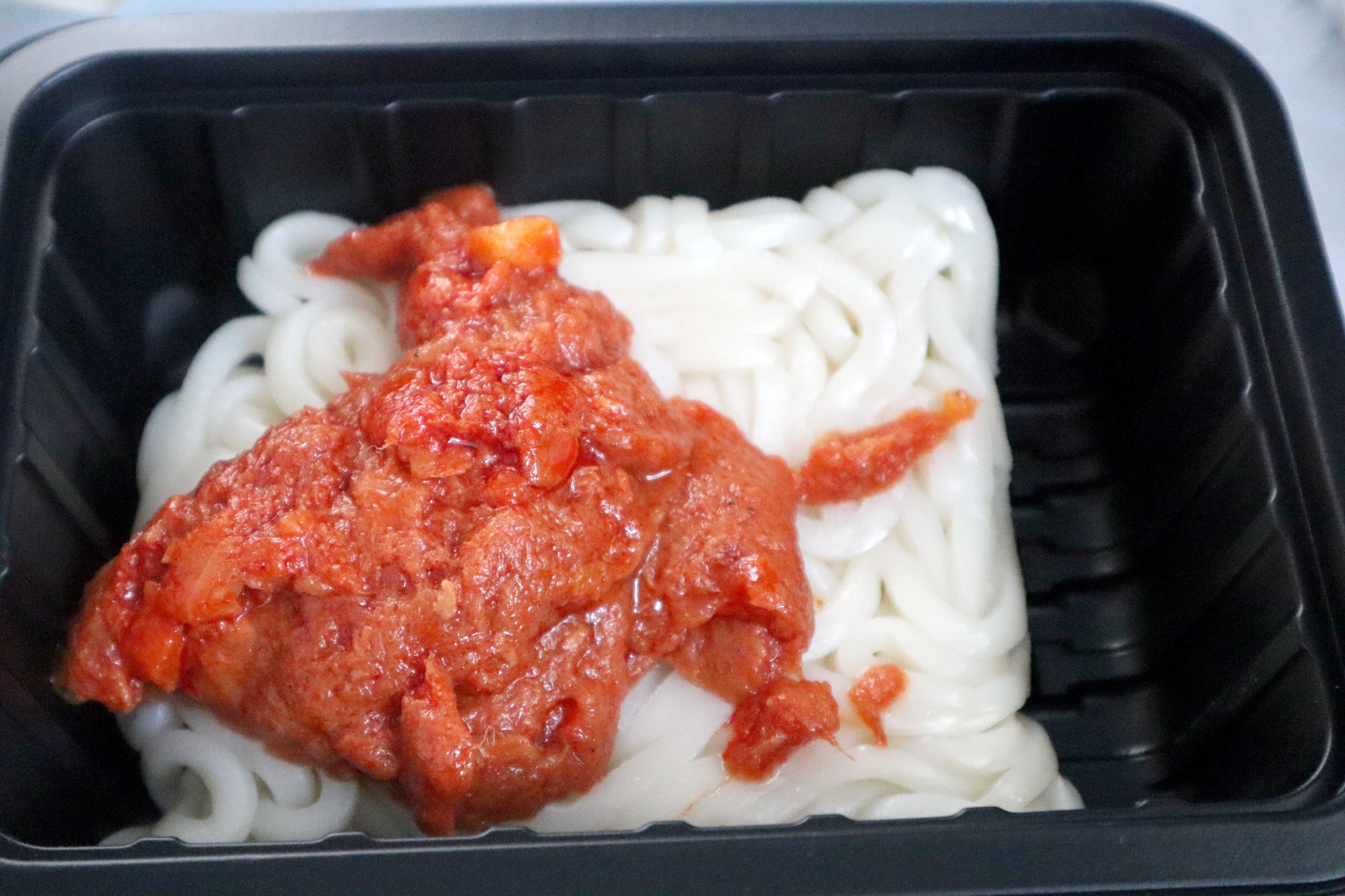 용기에 우동면과 고추참치비빔소스를 순소대로 넣은 후 용기를 흔들어 소스를 고루 펴줍니다.