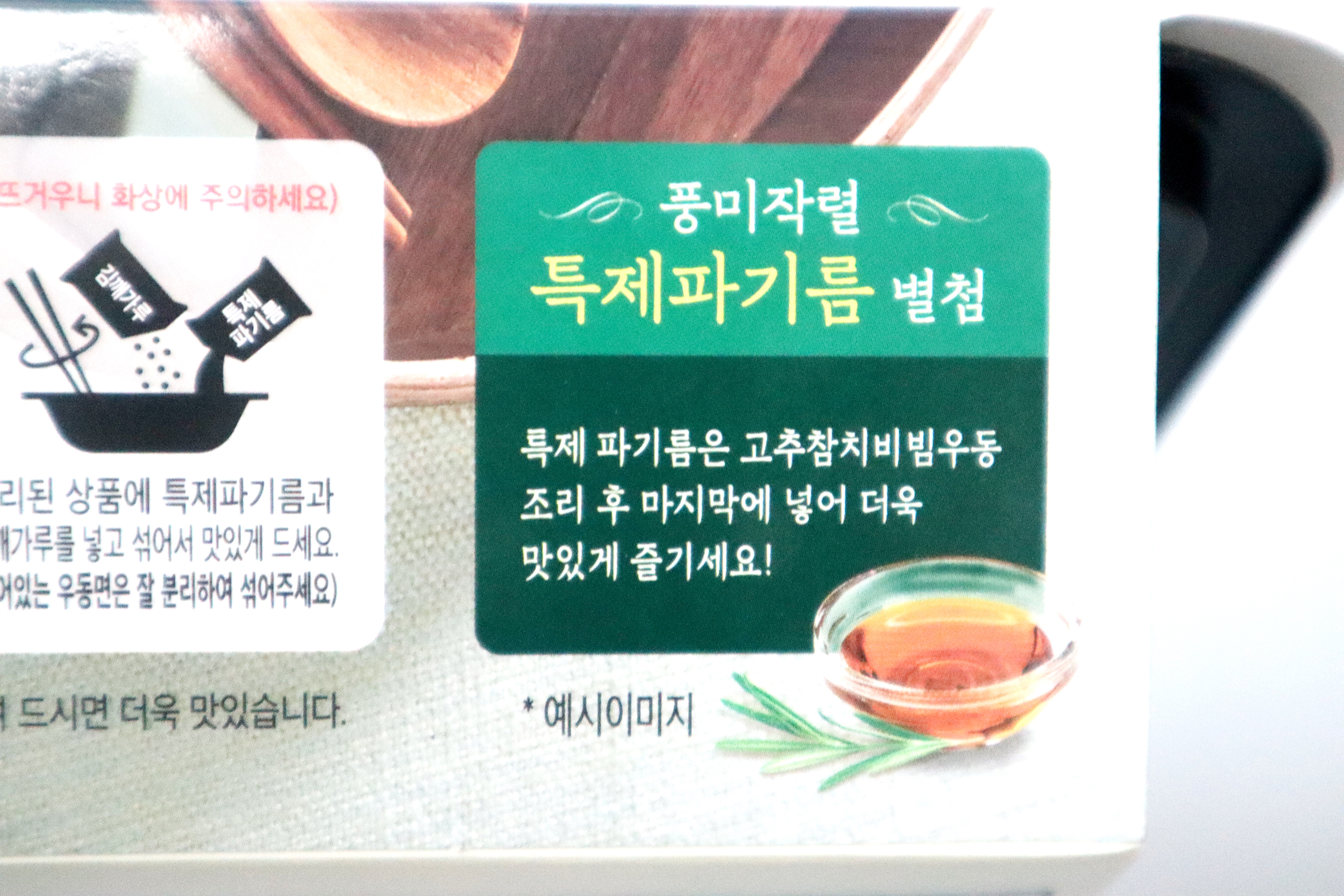 종이포장을 당겨서 빼면 고추참치비빔소스, 우동면, 김깨가루, 특제파기름이 들어있어요.