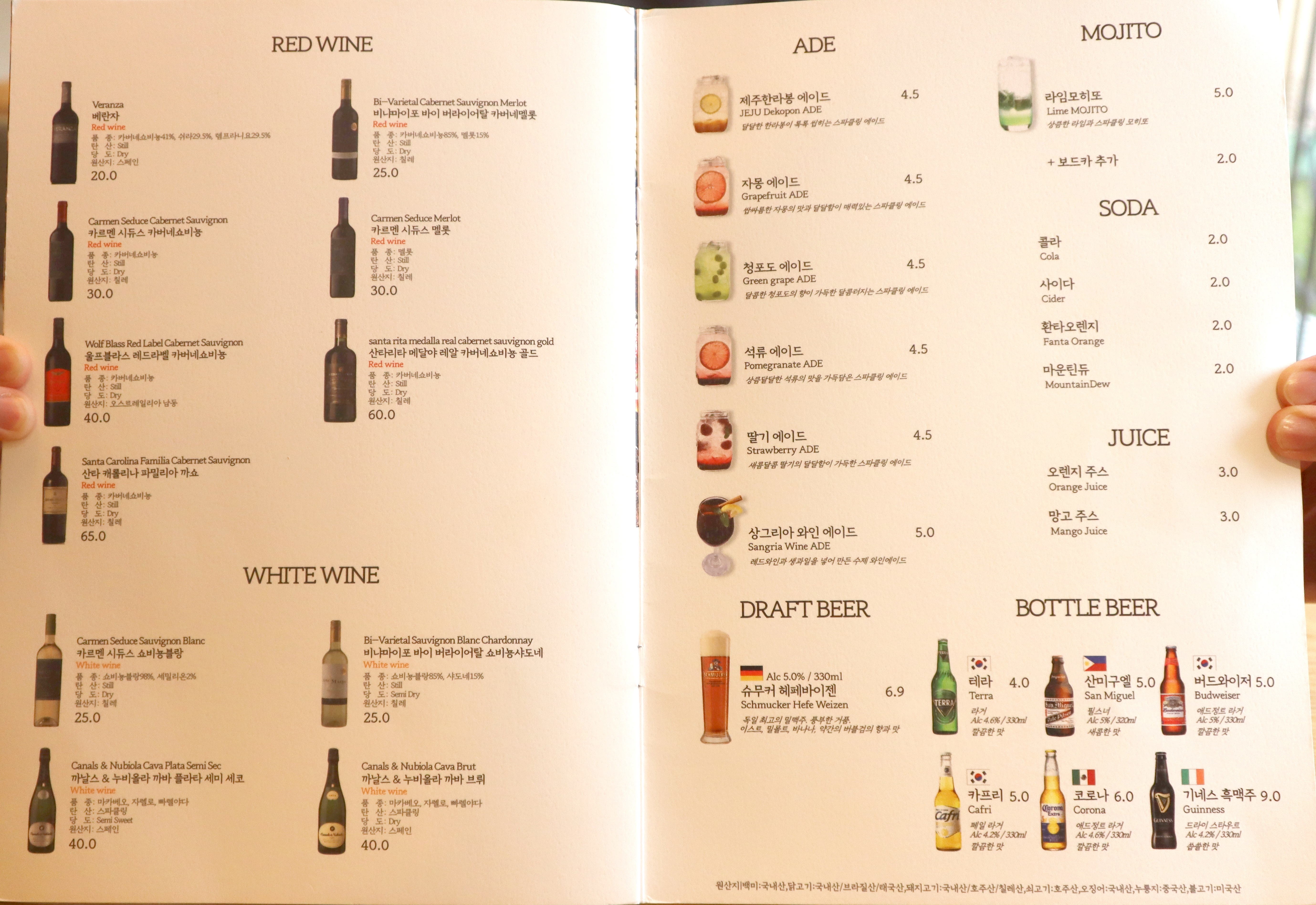 음료는 레드와인, 화이트와인, 에이드, 모히토 종류가 있고,