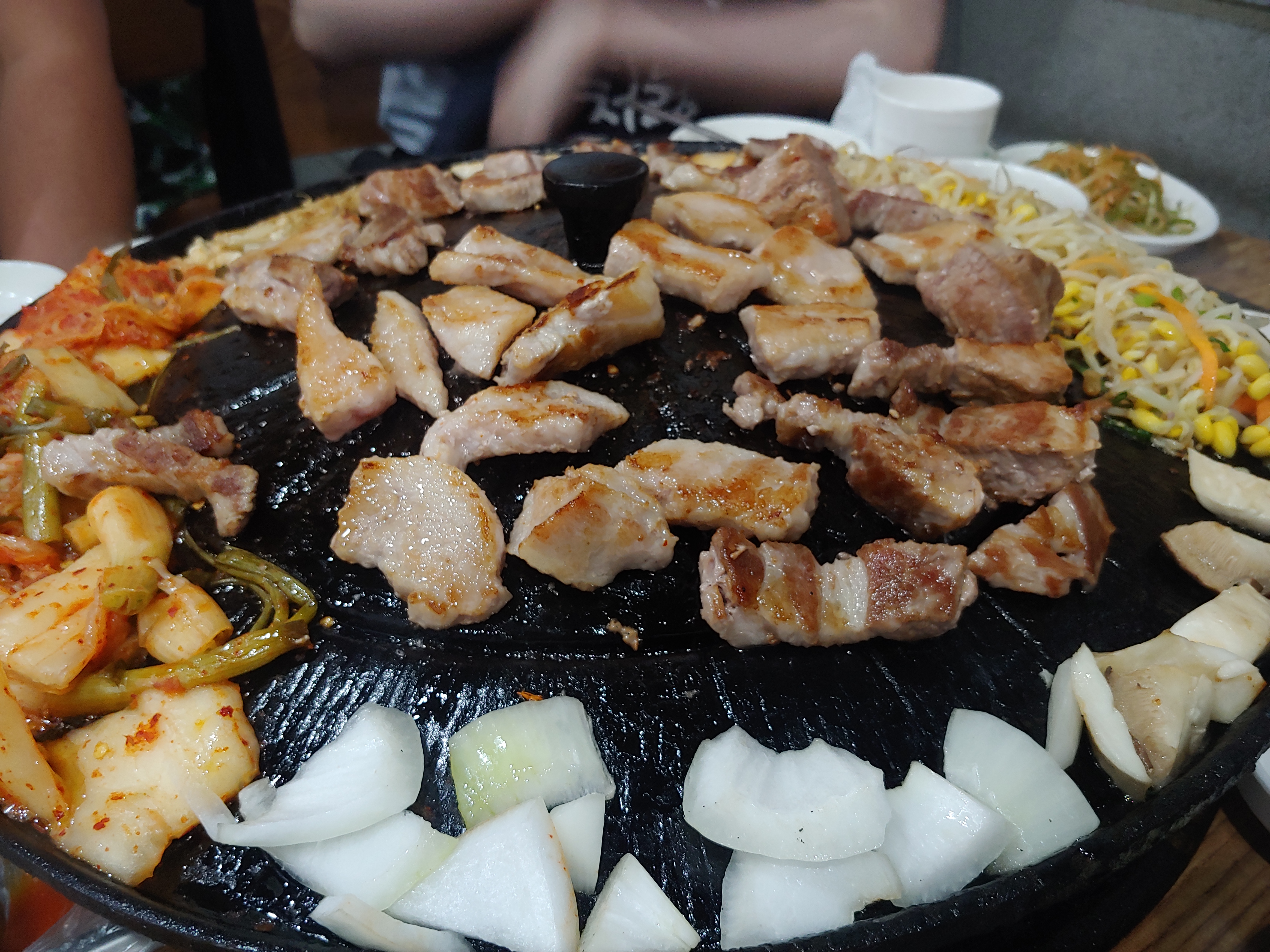 솥뚜껑 양 옆으로는 김치와 콩나물 무침이 올라감.