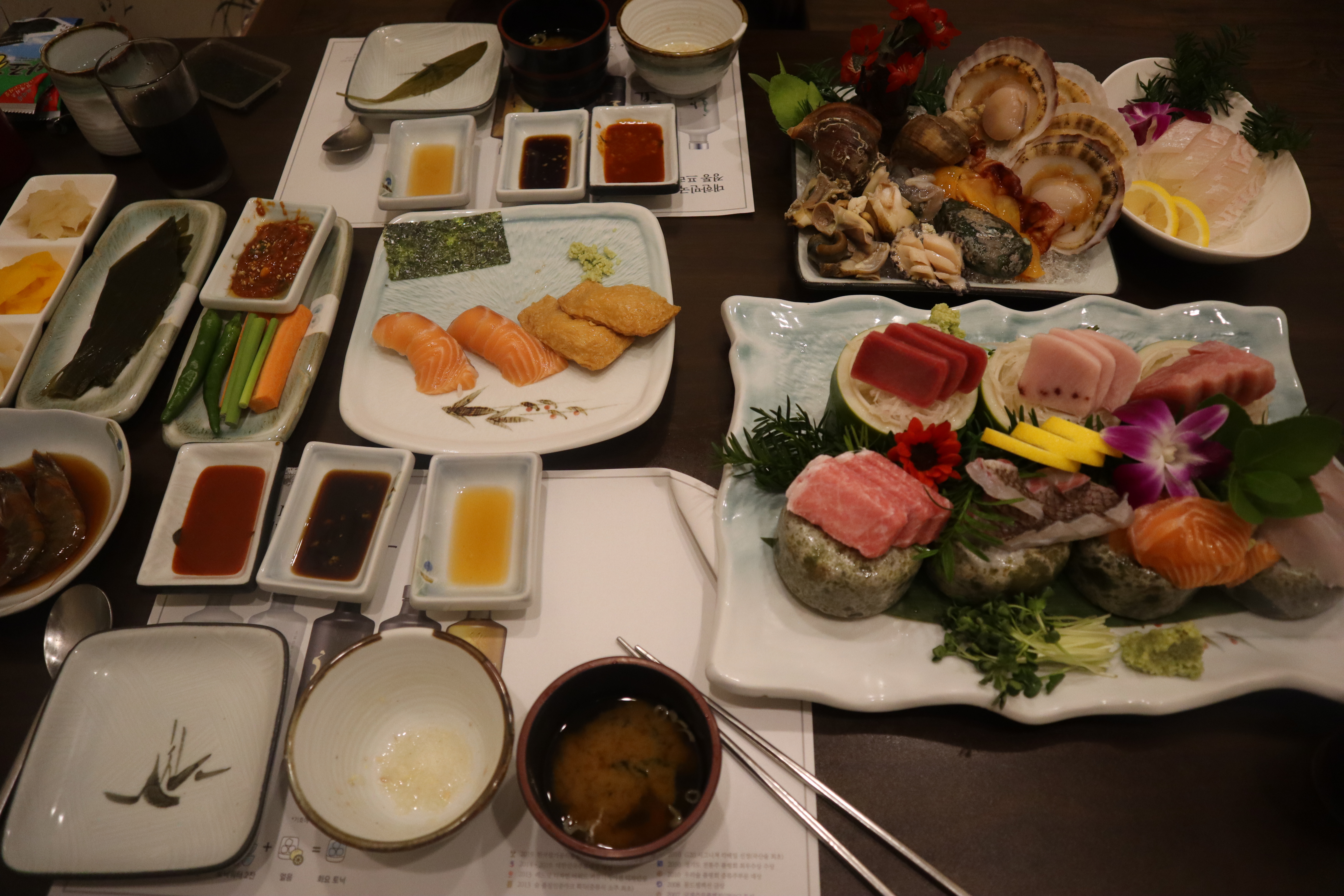 초반에 나온 죽, 초밥, 사시미, 해산물을 찍어봤어요.