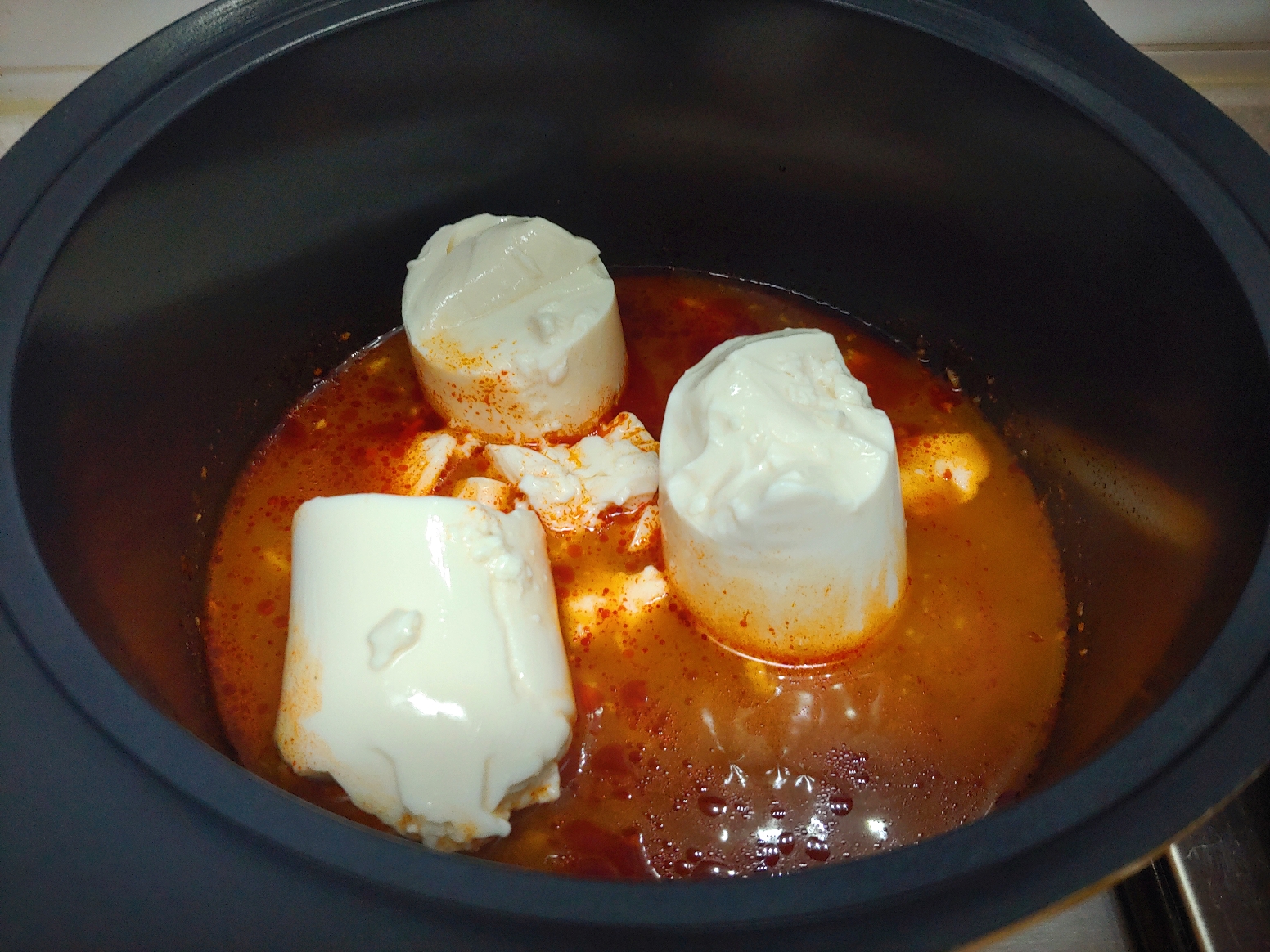순두부를 짜서 넣으시는 분도 있던데 저는 통으로 넣는 순두부를 좋아해서 순두부를 칼로 가른다음에 넣어주었어요.