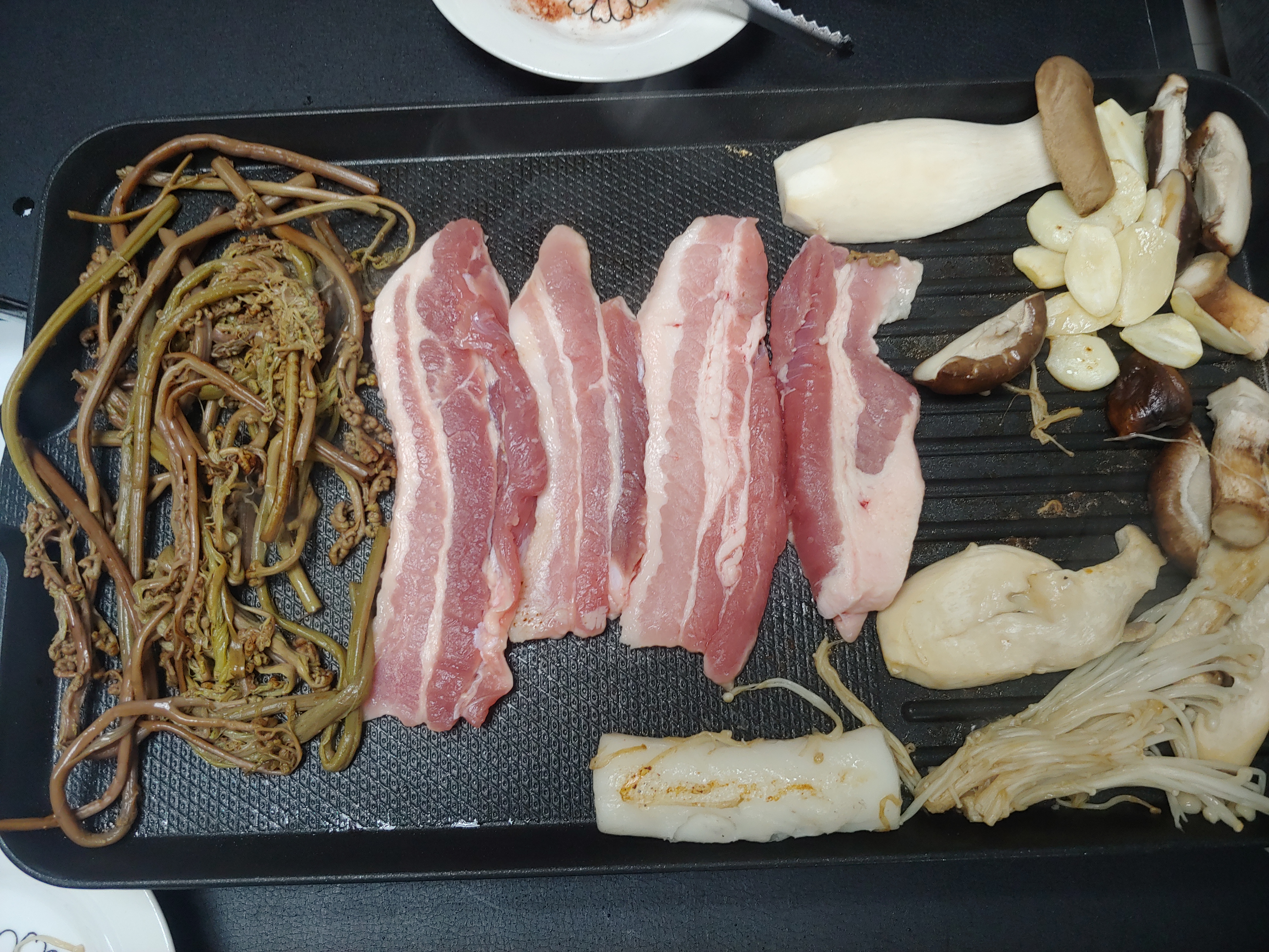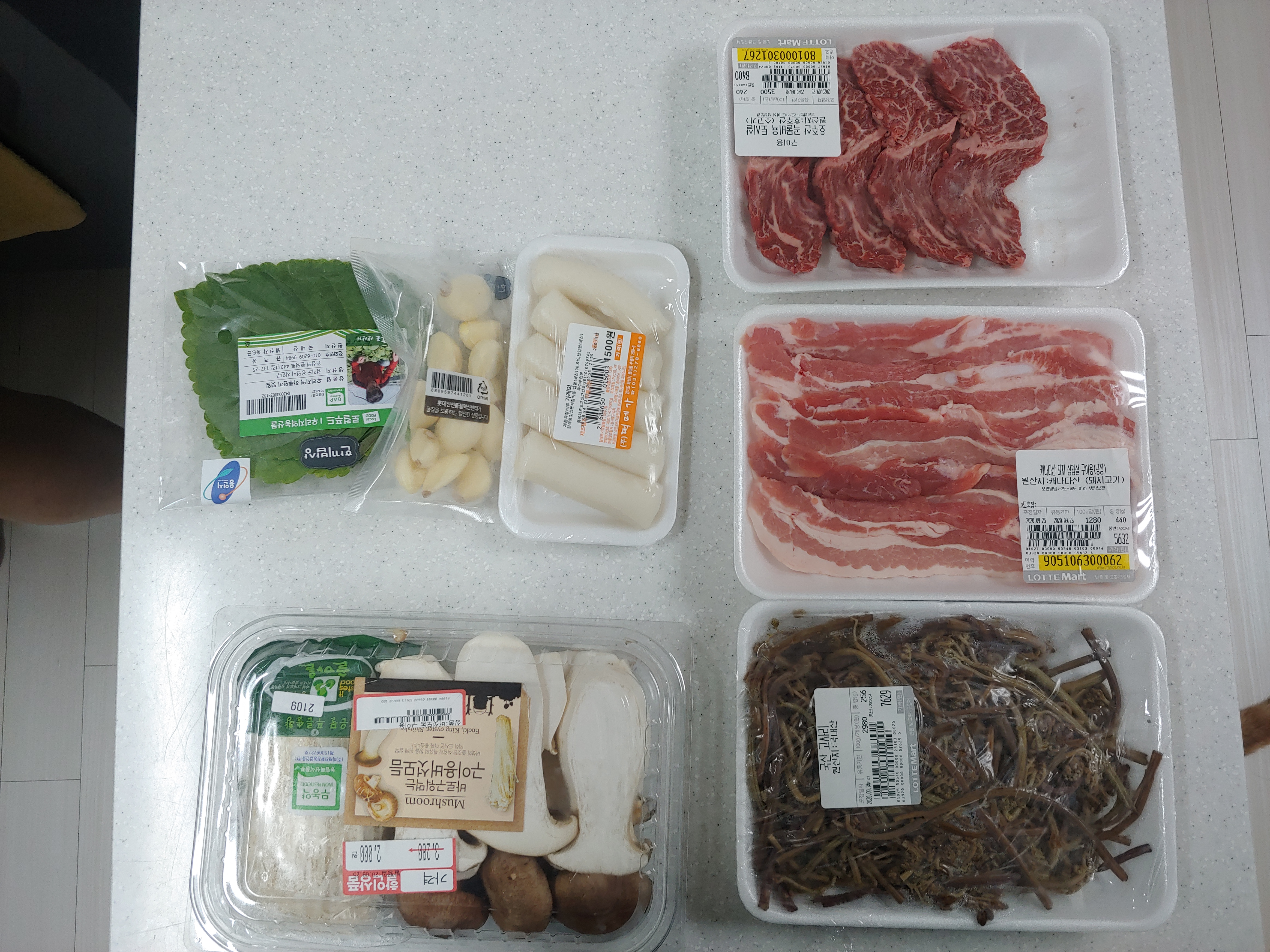 사온 재료는 삼겹살, 구이용 소고기, 버섯모둠, 마늘, 깻잎, 가래떡 그리고 고사리입니다.