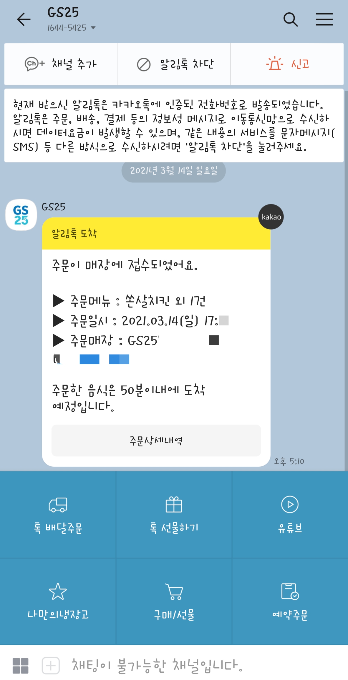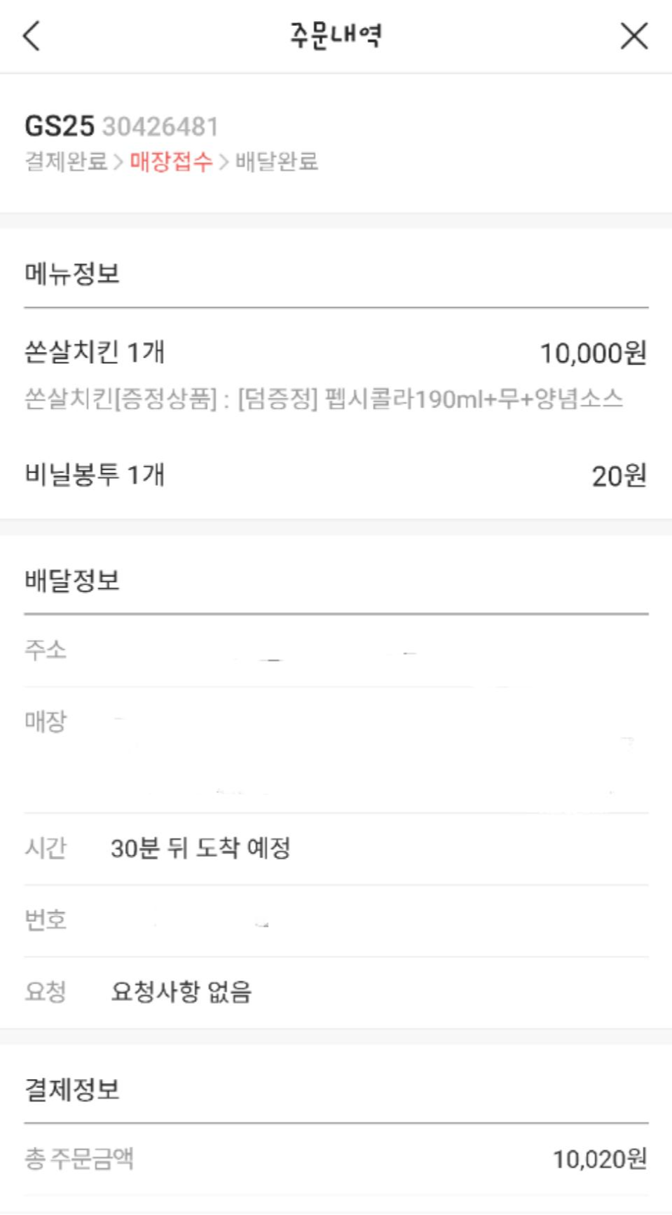 카카오톡 -> 주문하기에서 집 근처 편의점을 선택 후 쏜살치킨 주문완료 !